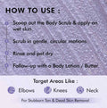 - Step 1: Take a generous amount of the Body Scrub and apply to damp skin.