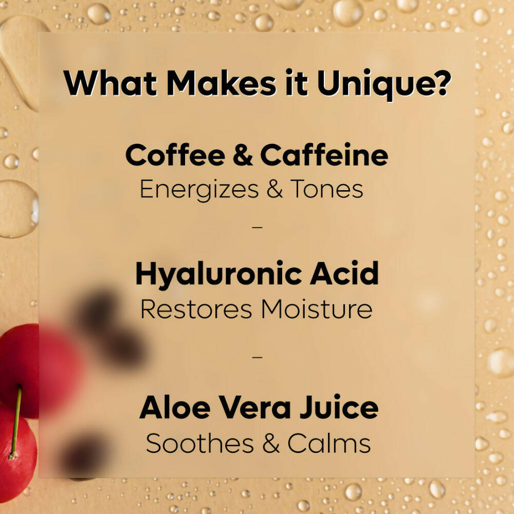 Featherlight & Alcohol-Free: This Cherry-Coffee Face Mist is both lightweight and non-sticky, making it perfect for use both under and over makeup. With a skin-friendly pH, this water-based, non-drying mist is suitable for all skin types. Infused with Aloe Vera Juice, Coffee, and Caffeine, it tones and alleviates skin irritation.