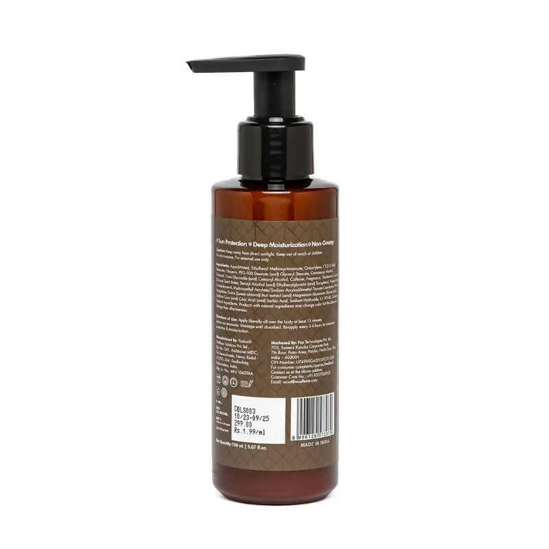 - Experience luxurious chocolaty hydration paired with sun defense in the Choco Body Lotion featuring SPF 15. Blended with Pure Cocoa, Cocoa Butter, Sweet Almond Oil, and Caffeine, it seamlessly absorbs into the skin, offering deep nourishment without any residue. SPF 15 along with advanced UV filters shields your skin from sun exposure. Additionally, antioxidant-rich Cocoa and Caffeine help repair sun damage and enhance skin barrier health for prolonged hydration. Enjoy stepping out into the sun with skin that feels and smells amazing, thanks to its lightweight hydration and sun protection. Suitable for all skin types and seasons.
