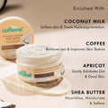 - Crafted to exfoliate and eliminate tan, this scrub is enriched with Soothing and Nourishing Coconut Milk to soften the skin and address hyperpigmentation. Coffee, abundant in antioxidants, diminishes tan and enhances skin texture. Apricot in this scrub softly exfoliates the skin to remove dirt, grime, and dead skin cells, leaving it clear and supple. Finally, Shea Butter moisturizes, nourishes, and softens the skin. The creamy consistency glides effortlessly, offering you a tropical indulgence with every shower!