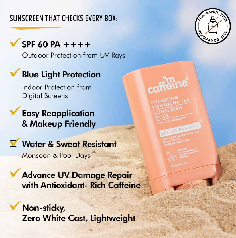 - Your ultimate solution for sun protection and hydration on-the-move. This sunscreen stick provides SPF 60 PA++++, shielding you from both UVA and UVB rays. It glides effortlessly over makeup without leaving a white residue. Infused with 1% Squalane for deep hydration, it imparts a radiant finish. The water and sweat-resistant formula includes Ceramides to restore the skin's barrier and prevent moisture loss. Kombucha Tea Extracts enhance skin texture, while antioxidant-rich Caffeine offers superior UV damage repair, combats free radicals, evens skin tone, and fortifies the skin barrier. Portable and easy to apply, this non-greasy, fragrance-free sunscreen revolutionizes your daily skincare regimen!