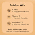 - The Coffee Body Wash is a concoction of ingredients including Coffee, Vitamin E, Caffeine, and Brazil Nut Oil. Coffee purifies deeply, while Caffeine tones and calms the skin. Vitamin E provides hydration, conditions, and leaves the skin soft and smooth. Brazil Nut Oil, abundant in antioxidants, nourishes and softens the skin.