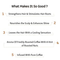 - Enjoy a luxurious hair treatment with the Coffee Hair Mask, essential for achieving nourished and resilient hair. Regular application leads to hair that is 10 times stronger compared to using a neutral product. Infused with Caffeine, this rich and sumptuous mask minimizes hair fall and breakage. It fills the air with the enticing scent of freshly brewed coffee with a touch of roasted nuts, enhancing your hair care routine.