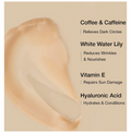 - Coffee, Caffeine, White water lily, Vitamin E, Sweet Almond Oil, Hyaluronic Acid, Aqua, Shea Butter, Caramel
