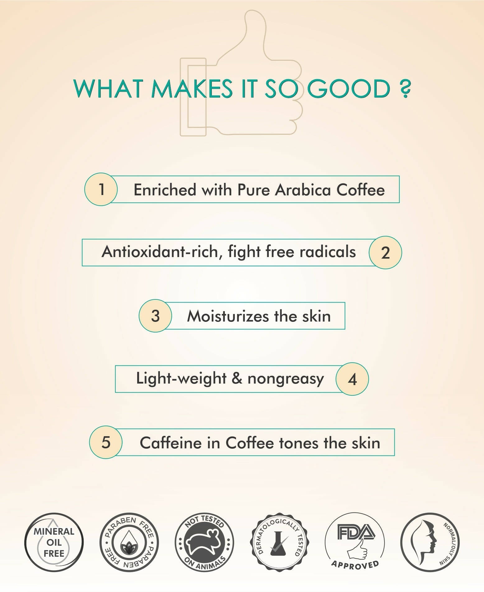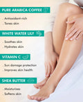 - Fortified with Pure Arabica Coffee, this lotion is rich in antioxidants that combat skin-damaging free radicals. Coffee serves as a potent and natural source of Caffeine, known for its skin-toning properties. The inclusion of White Water Lily calms the skin while maintaining optimal hydration. Moreover, Vitamin C serves as a natural shield against the sun and boosts overall skin health.