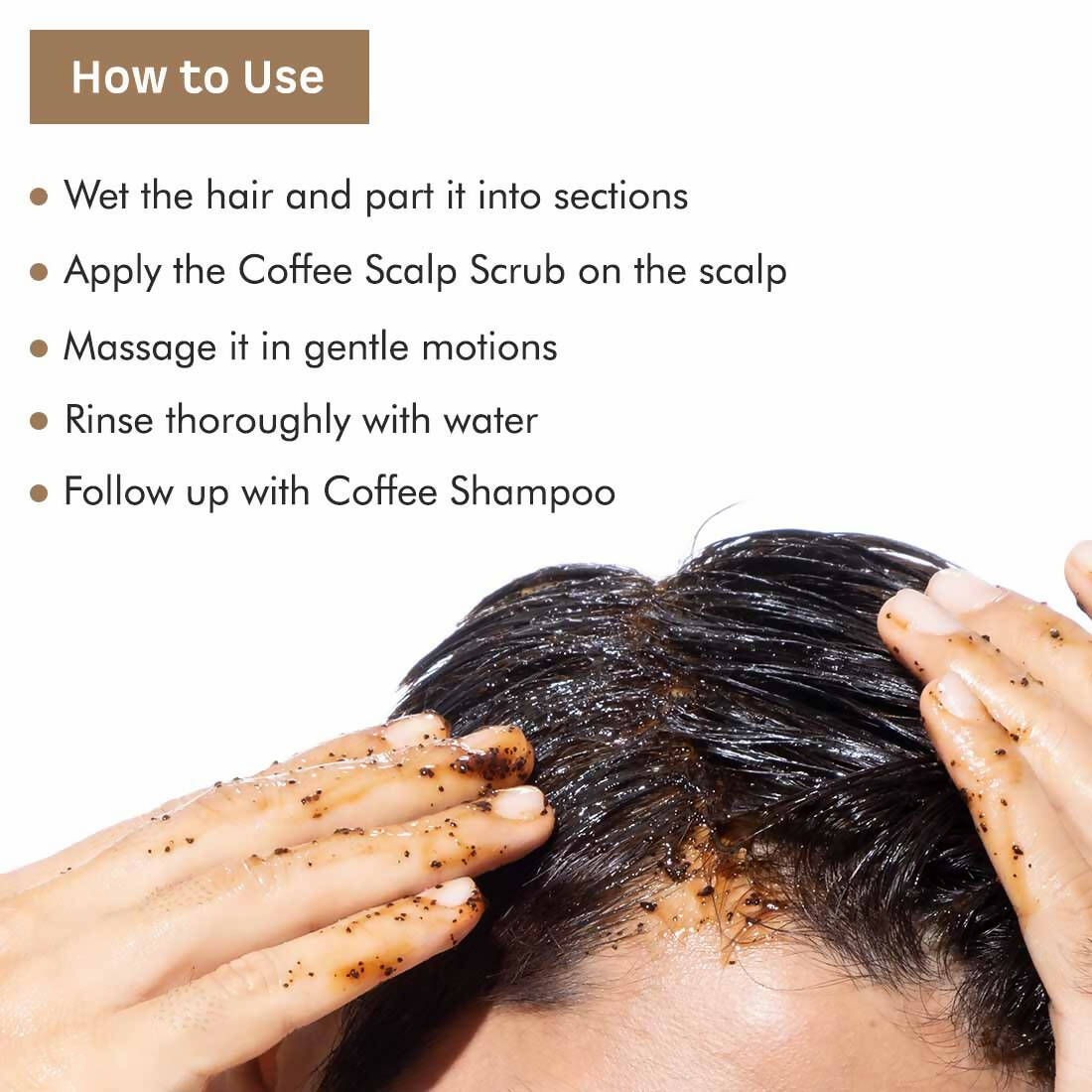 - The Coffee Scalp Scrub is enriched with Coffee Powder, Caffeine, Natural AHA, and Rosemary. Coffee Powder and Natural AHA excel in exfoliating and removing dandruff. Caffeine energizes the roots, while Rosemary soothes and calms an irritated scalp. The perfectly sized Coffee particles effortlessly cleanse the scalp, making a haircare routine with the Scalp Scrub easy to perform at home.