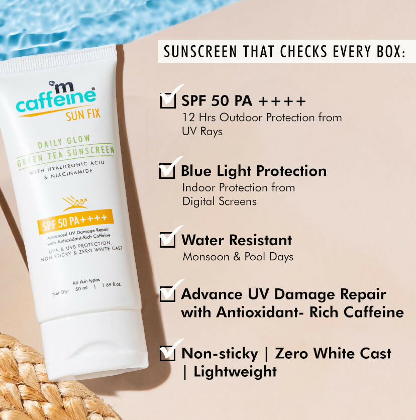 mCaffeine Sun Fix Daily Glow Green Tea Sunscreen SPF 50 PA++++ with Niacinamide, Lightweight & No White Cast