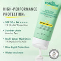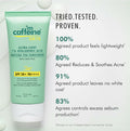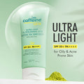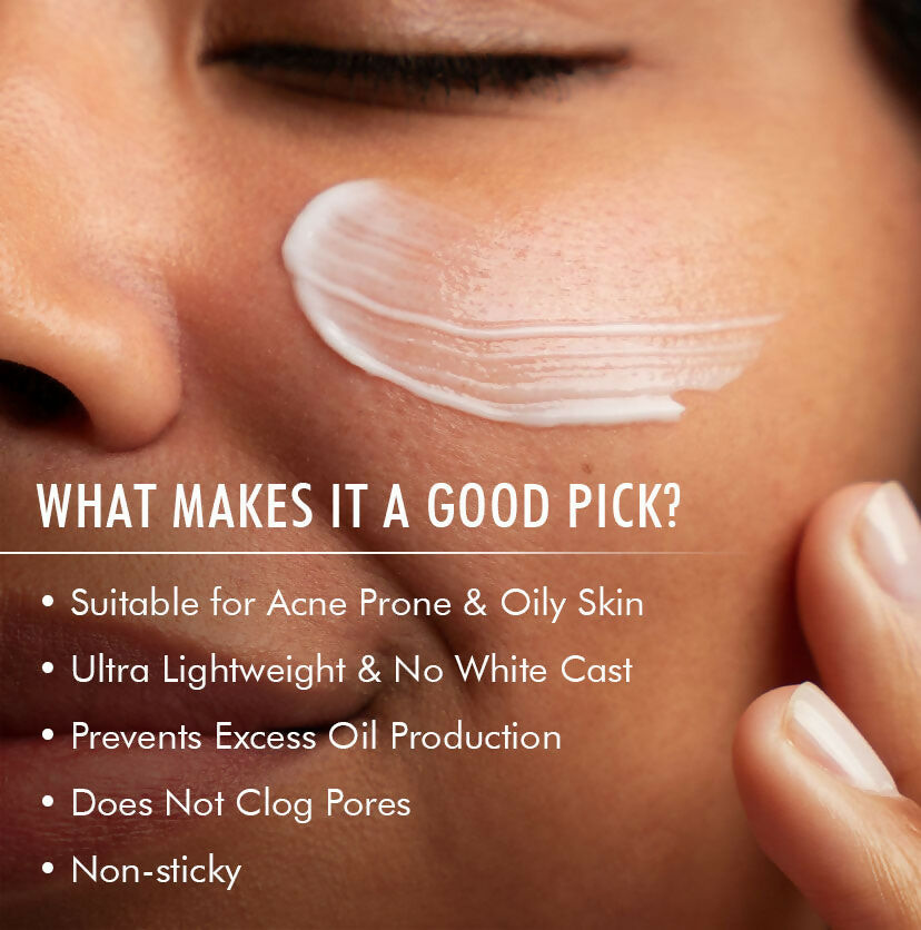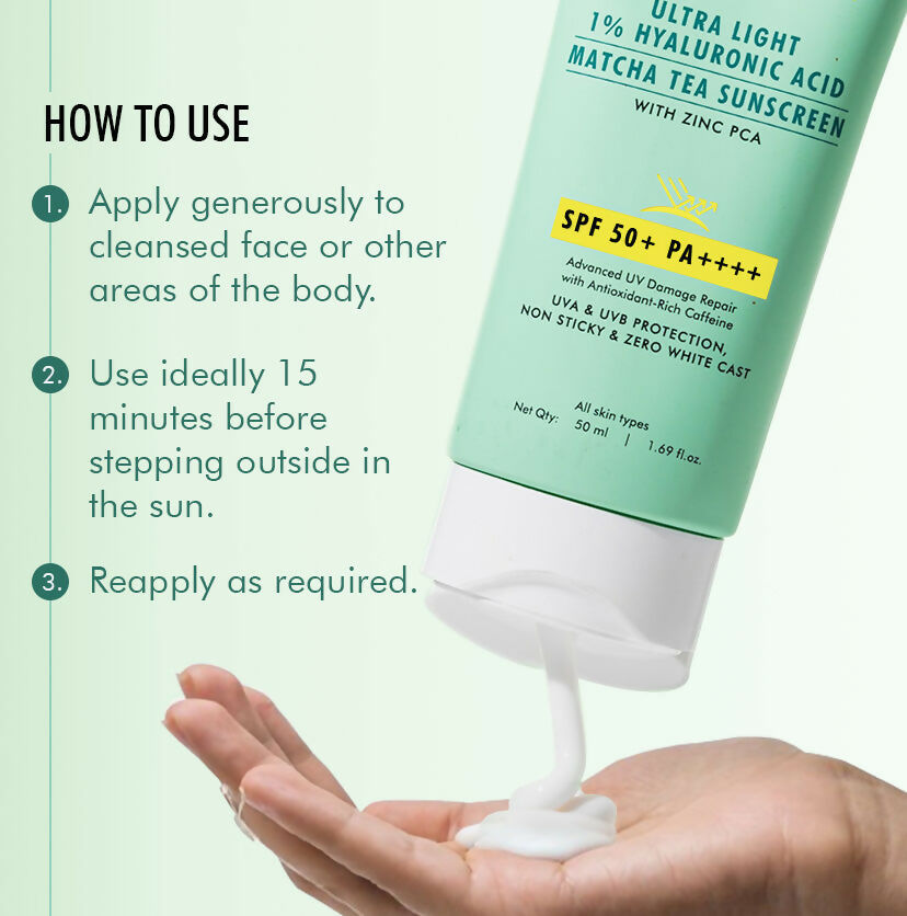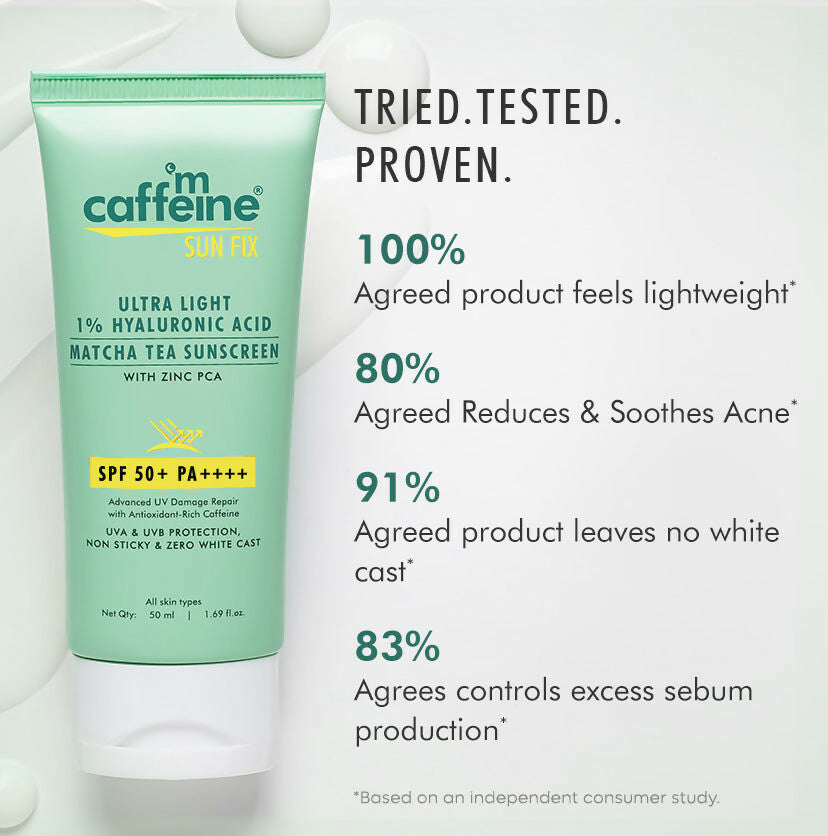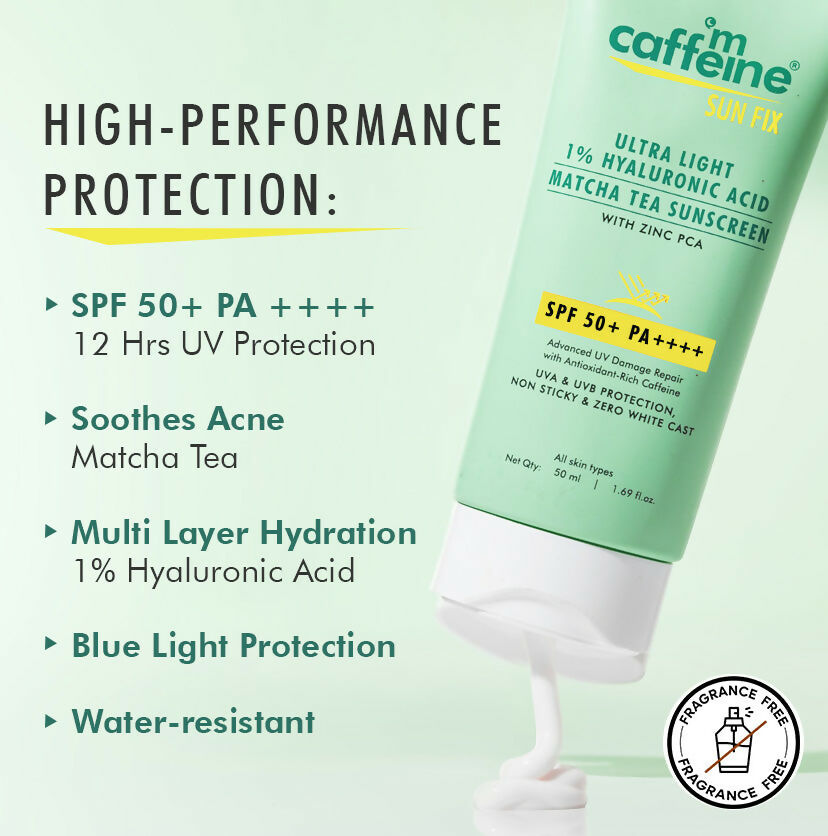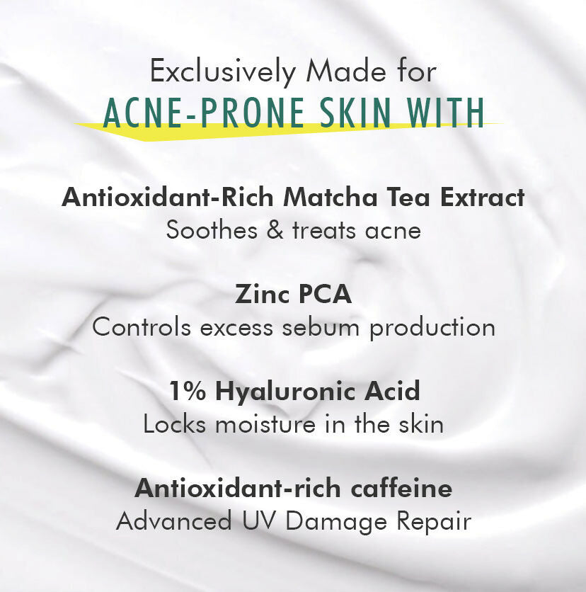 - This ultra-light sunscreen is tailored for those with acne-prone skin! Boasting SPF 50+ PA ++++, it ensures 12 hours of defense against UV rays and blue light. It's non-greasy, leaves no white residue, is water-resistant, and absorbs swiftly. The formula contains 1% Hyaluronic Acid to lock in moisture without a greasy feel. Zinc PCA helps to regulate excess oil production and reduces redness and irritation. Infused with antioxidants from Matcha Tea Extract, it helps to combat acne and enhances overall skin health. Caffeine provides intense hydration, leaving the skin soft, smooth, and supple. Fragrance-free | Tear Free | absorbs quickly