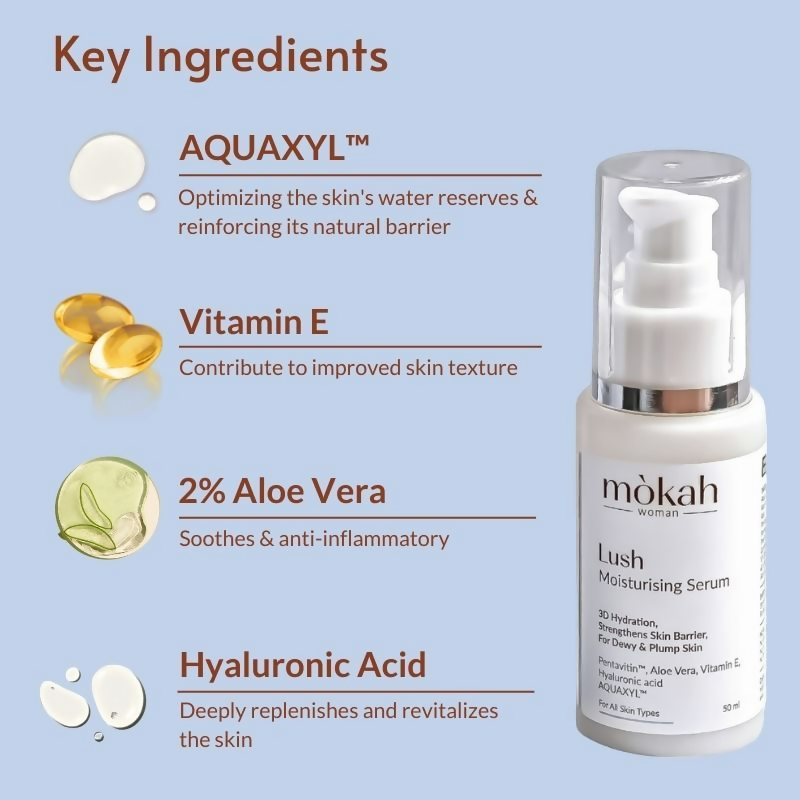 About the Products:- Mokah Woman Lush is an innovative 2-in-1 moisturizer-serum concoction that delivers profound 3D hydration while reinforcing the skin's defense barrier. Infused with Pentavitin, this formulation provides moisture retention for up to 72 hours, ensuring your skin remains supple and hydrated. With six potent active components, including 3% aloe vera, it aims to illuminate and plump the skin, offering deep nourishment without the weight of conventional creams. Crafted to diminish pigmentation and dark spots, Lush also tackles skin dullness, promoting a luminous complexion. Its airy, non-greasy texture is ideal for all Indian skin types, ensuring even sensitive skin feels cozy and revitalized. The product comprises key ingredients such as niacinamide, hyaluronic acid, vitamin E, and shea butter, renowned for their hydrating and skin-repairing qualities. Dermatologically tested and cruelty-free, Mokah Woman Lush is an essential addition to your daily skincare regimen. Offered in a handy 50 ml size, it’s the perfect option for achieving beautifully hydrated and radiant skin.