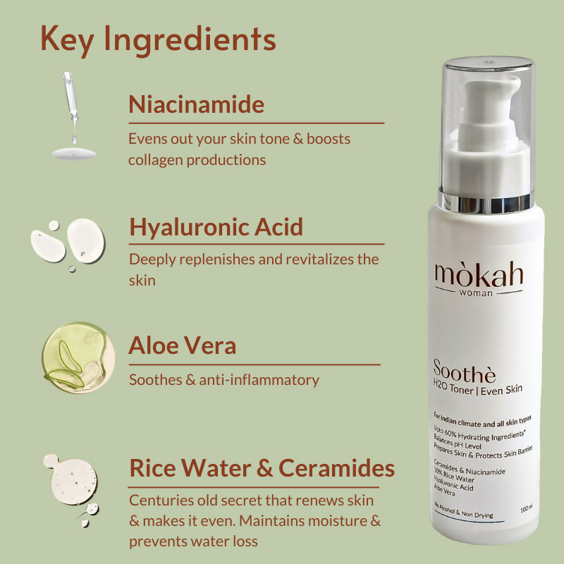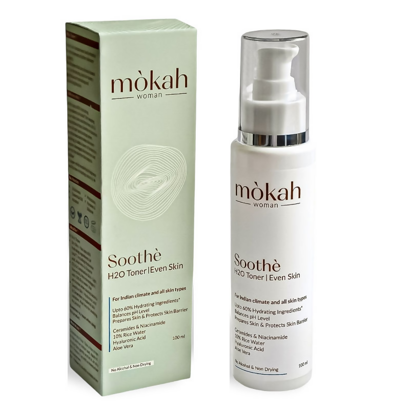 Product Overview:- Discover the Mokah Woman Soothe, a replenishing and calming toner crafted to maintain clean, pH-balanced skin. Enriched with up to 60% moisturizing components, this gentle, alcohol-free, and unscented formula is ideal for sensitive skin types. Containing 10% rice water and ceramides, it offers vital hydration while fortifying the skin barrier, enhancing overall skin wellness. The addition of hyaluronic acid and niacinamide boosts moisture retention and soothes irritated skin. Soothe effectively primes your skin for the next steps in your skincare, leaving it feeling invigorated and rejuvenated. Its soft, non-drying formula ensures your skin remains comfortable and hydrated all day long. Suitable for all Indian skin types, Mokah Woman Soothe is cruelty-free, making it an excellent choice for anyone seeking a calming and nourishing toner. Available in a 100 ml bottle, it's an essential part of your skincare arsenal for achieving a luminous complexion. A toner is an indispensable item in any skincare regimen.