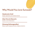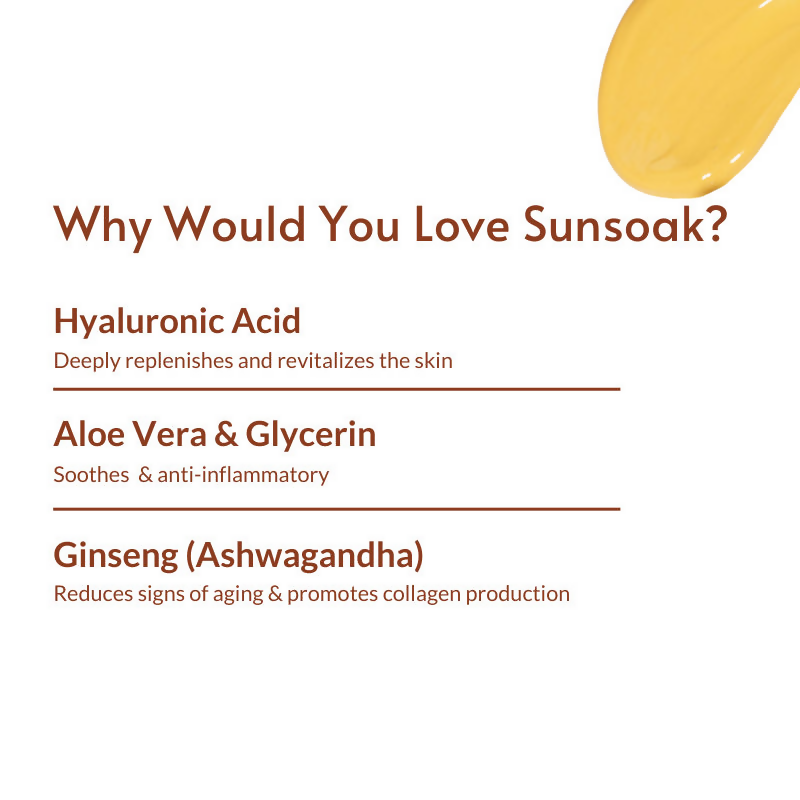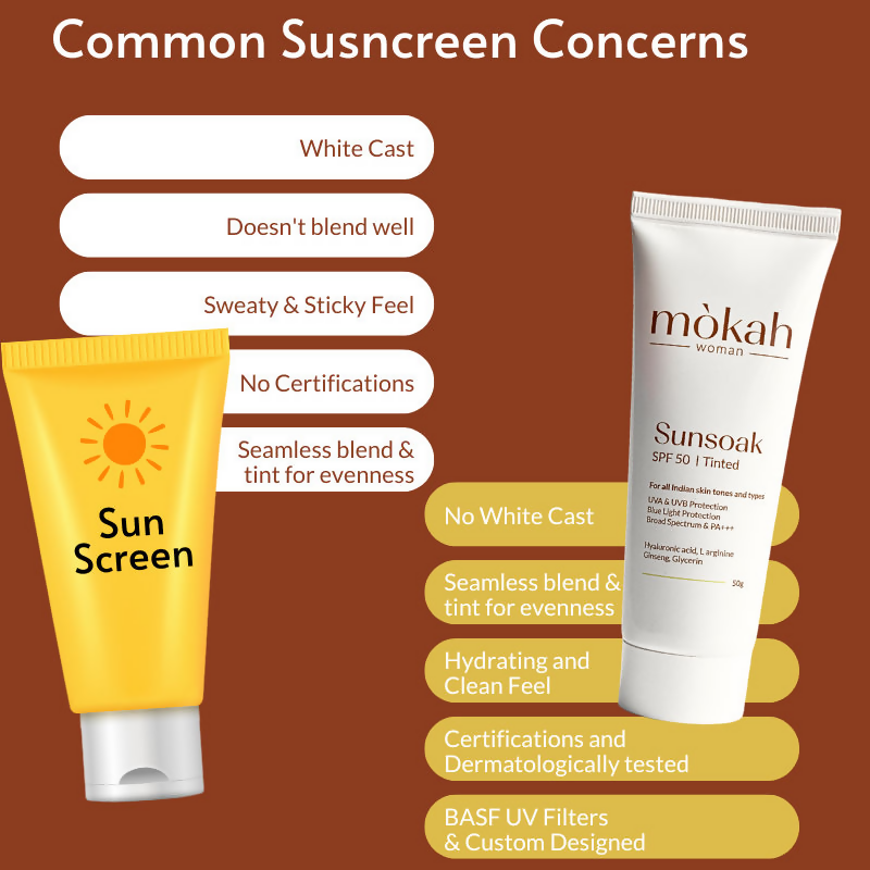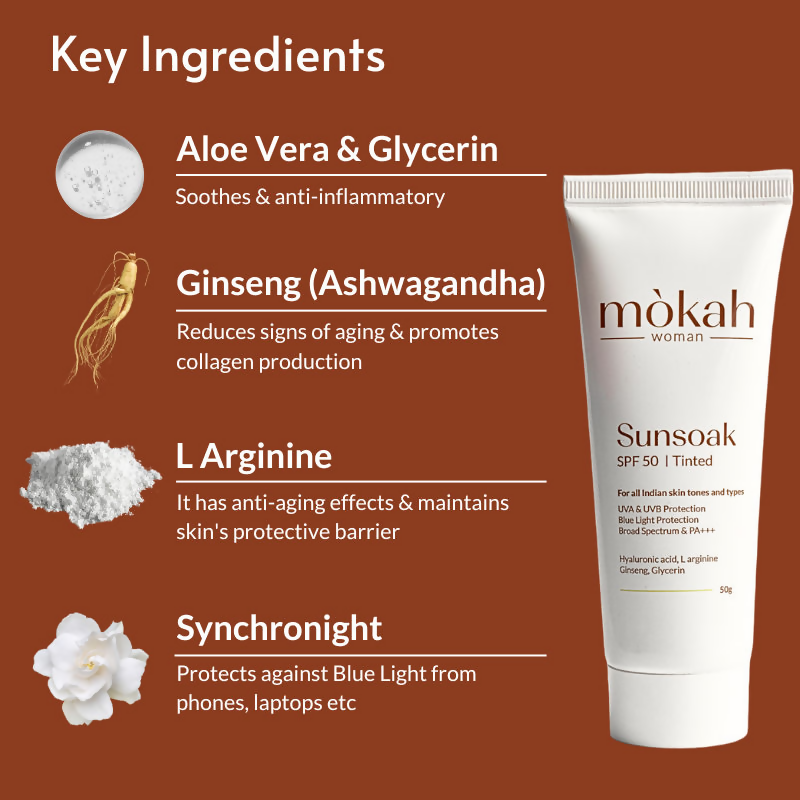 About the Products:- The Mokah Woman Sunsoak SPF 50 Tinted Sunscreen is crafted to deliver comprehensive defense against UVA, UVB, and blue light, making it ideal for daily use. This featherlight formula seamlessly merges with the skin, thanks to its universal tint that imparts a natural, makeup-free appearance without any white residue. Infused with moisturizing elements such as hyaluronic acid and aloe vera, it not only shields but also nurtures the skin, ensuring it stays supple, smooth, and radiant. Suitable for all skin types, even sensitive ones, it retains moisture while providing anti-aging advantages. Dermatologically evaluated and cruelty-free, Sunsoak offers enduring protection with a non-sticky, non-greasy texture that remains comfortable all day. Offered in a handy 50 gm size, it's perfect for travel, keeping your skin safeguarded and luminous wherever you venture. Ideal for those seeking a versatile sunscreen with extra skincare benefits. The 3-in-1 sunscreen - moisturizer, sunscreen & tint.