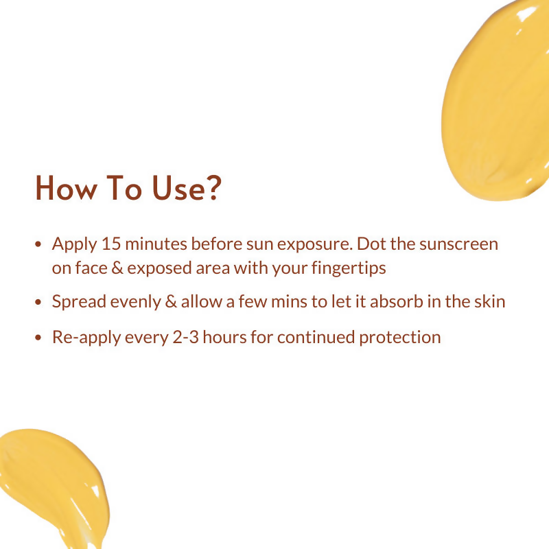 - Apply 15 minutes prior to sun exposure. Dab the sunscreen on your face & exposed areas using your fingertips.