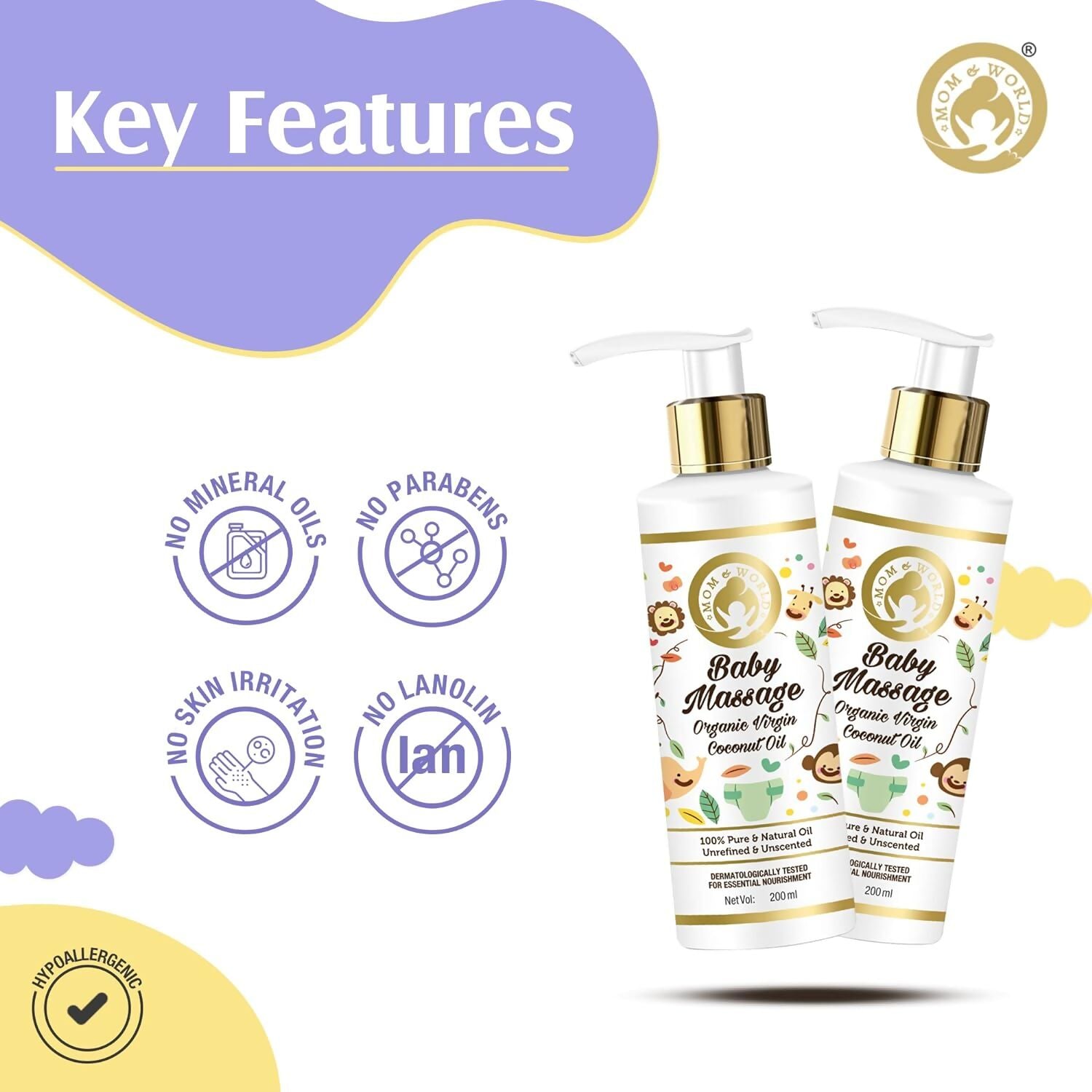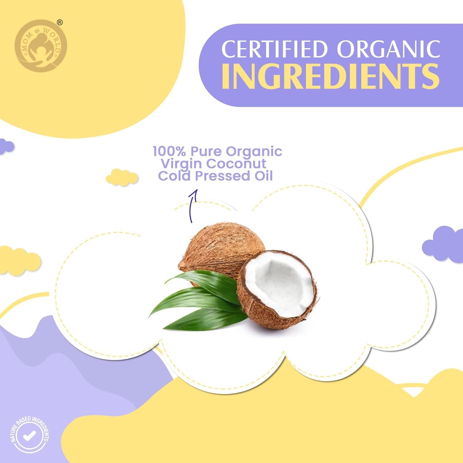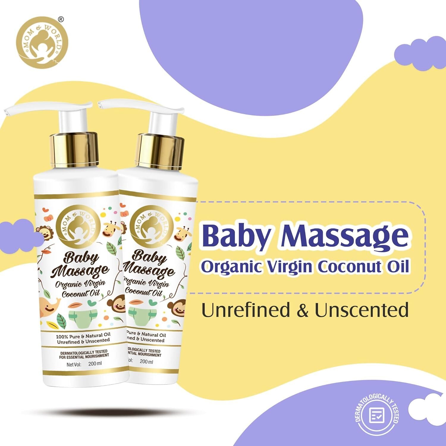 - Mom and World Baby Massage Organic Virgin Coconut Oil is nature's treasure trove of benefits encapsulated in coconuts. Renowned for their nourishing properties, coconuts are an ideal source of oil for your baby's delicate skin. Celebrated as a cherished gift from nature, coconuts offer numerous advantages for your newborn. This is why we rely on them for the tender care of your baby's skin. Every drop of Mom and World Baby Massage Organic Virgin Coconut Oil is pure and untainted, offering a natural sanctuary from harsh chemicals. Sourced from premium fresh coconuts, this oil provides comprehensive nourishment from head to toe, catering especially to dry and sensitive skin, and enhancing overall radiance.