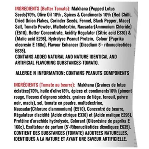 Makhana, Olive oil, Sugar, Spices & Condiments (Red chilli, Dried Onion Flakes, Coriander Seeds, Fennel, Black Pepper, Mace), Salt, Tomato Powder, Maltodextrin, Nausadar (Ins 150), Butter Concentrate, Acidity Regulators (Ins 330) & (INS 296), Hydrolyse Peanut Protein, Colour (Ins 160c), Flavor Enhancer (Ins 635).