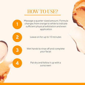 Step 1: Gently massage onto clean, damp skin in a circular motion. The formula transitions from orange to white, indicating effective physical exfoliation and uniform application. Allow it to remain on the skin for up to 10 minutes.