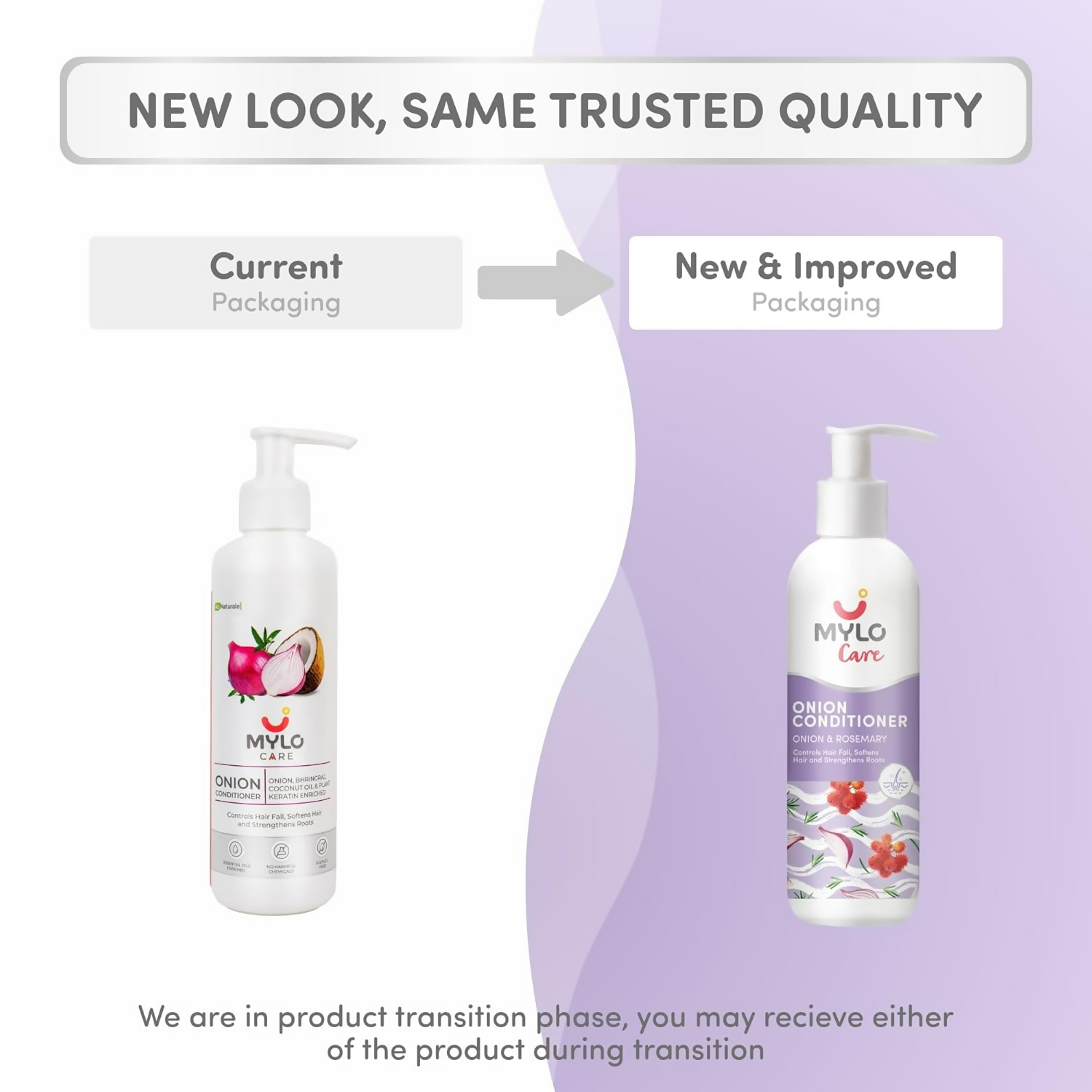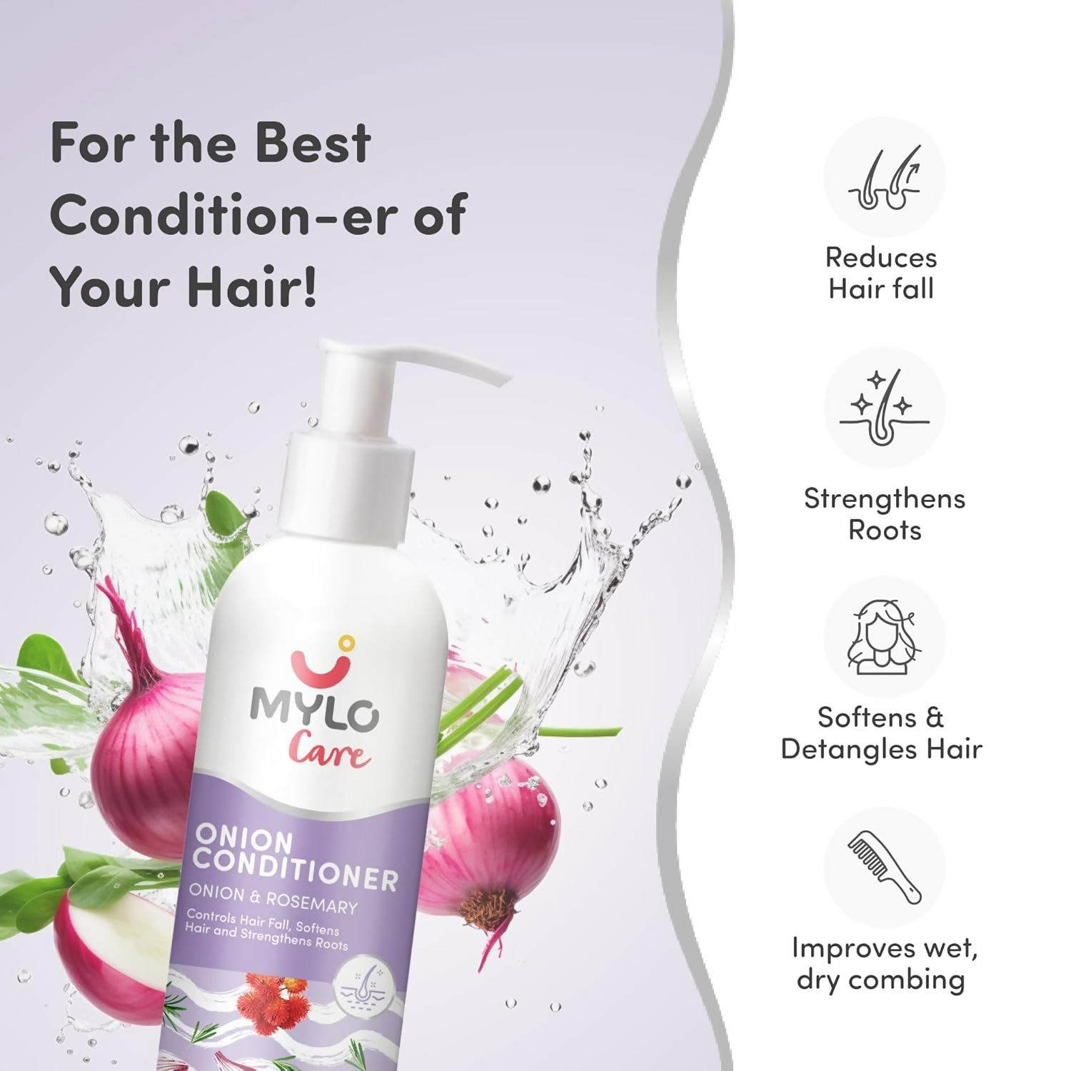 About the Product:- Infusion of Natural Elements - Mylo Care Onion Anti Hair Fall Conditioner is enriched with natural components such as Red Onion Oil, Plant Keratin, Bhringraj, D-Panthenol, Coconut oil, and Almond Oil. These are natural hair care ingredients that assist in curbing hair fall. Mylo Care Onion Conditioner aids in mending damaged hair and helps diminish hair breakage.