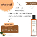 - Avocado oil is a 100% pure, cold-pressed oil derived from fresh, premium avocado seeds without the use of heat or refining agents. It is packaged in its natural, unrefined form to ensure maximum nutrient preservation.