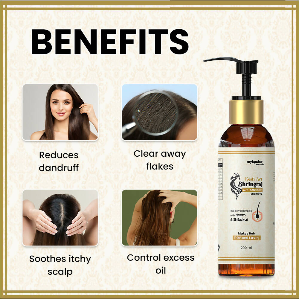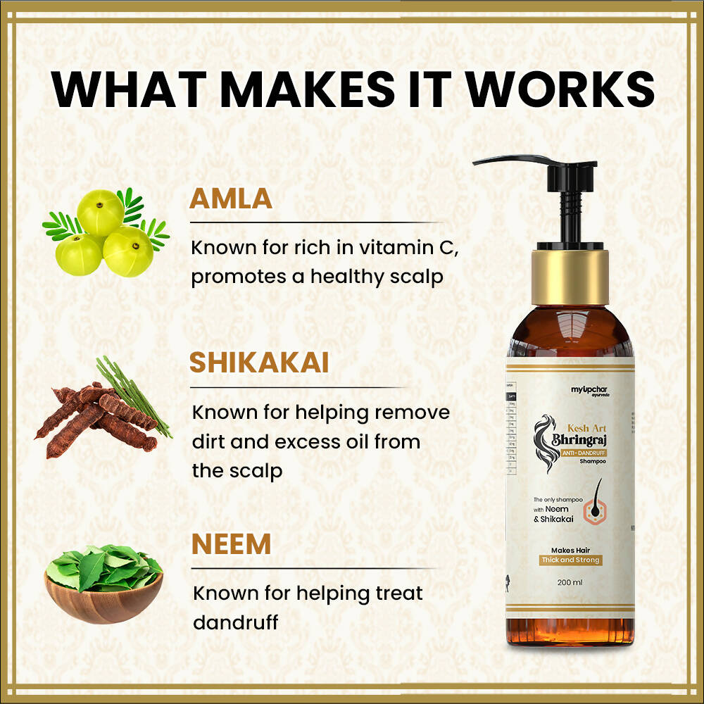 About the Product:- Kesh Art by myUpchar Ayurveda offers a premium collection of Ayurvedic solutions designed to address issues like dandruff, hair loss, thinning hair, and damaged hair naturally and completely. The Kesh Art Anti-Dandruff Shampoo has been meticulously crafted following thorough research and testing, incorporating only natural components. Bhringraj, the primary ingredient, is renowned for its antimicrobial and antifungal attributes that effectively reduce dandruff. It also encourages the development of hair follicles and curbs hair loss. Enhanced with potent Ayurvedic herbs such as Neem, which promotes hair growth, and Shikakai, which imparts softness and shine to hair, this shampoo stands apart from regular shampoos as it is entirely devoid of parabens, sulfates, silicones, synthetic dyes, and fragrances. For optimal results, adhere to the instructions provided and embrace a comprehensive Ayurvedic hair care regimen.