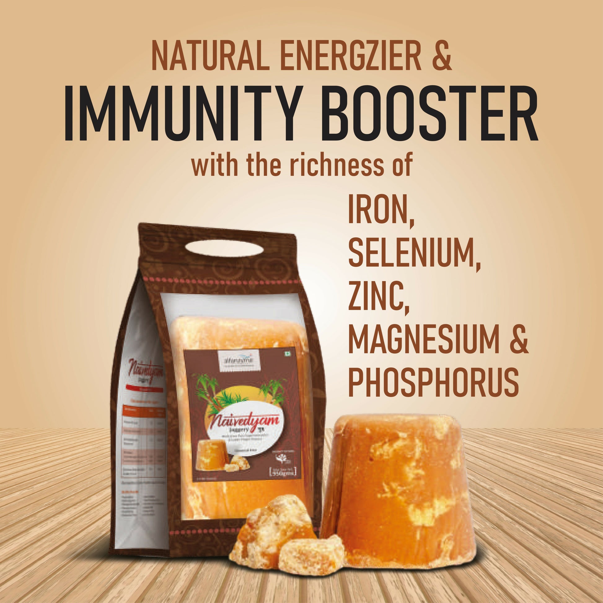 About the product:- Experience the natural sweetness of Alfanzyme Naivedyam jaggery. Crafted from pure sugarcane juice, this jaggery is abundant in minerals and devoid of chemicals, presenting a healthier option compared to refined sugar.