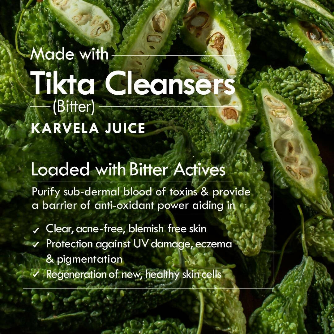 - Experience the Revitalizing Power of Bitter Cleansing with Fresh Daily Tikta. This formulation is enriched with bitter elements from karvela juice (karela), illuminating raw milk, cashew paste, and more for thorough purification, deep tissue renewal, and blood detoxification, bestowing a healthy, enduring, supple radiance and clarity to your skin. Crafted with fresh milk cream as its base, this face wash ensures hydration is retained during cleansing. It is a 100% naturally derived product, providing a chemical-free, sulfate-free, and paraben-free cleansing experience.