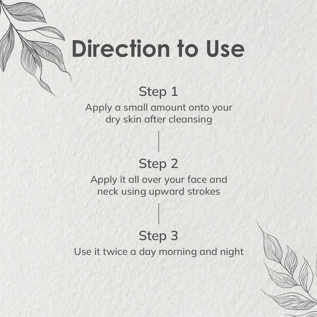 Profound Moisturization with Hyaluronic Acid: Fortified with Hyaluronic Acid, this serum provides exceptional moisture to your skin. Hyaluronic Acid retains water efficiently, offering deep hydration and plumping benefits. It aids in smoothing fine lines and wrinkles, keeping your skin moisturized and resilient throughout the day.
