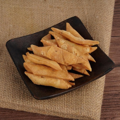 Delight in these ribbon-like pastry strips, meticulously seasoned with ajwain and cumin seeds, all enriched with pure ghee. Experience these delightful snacks today!