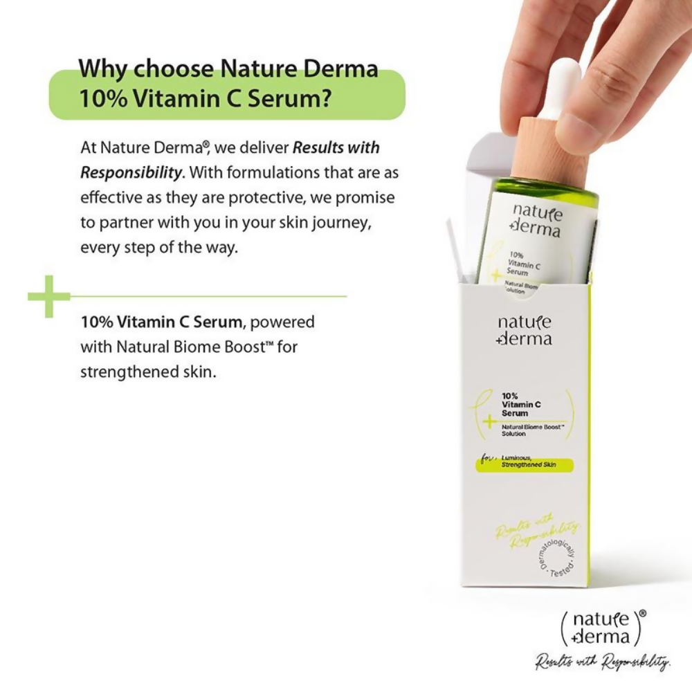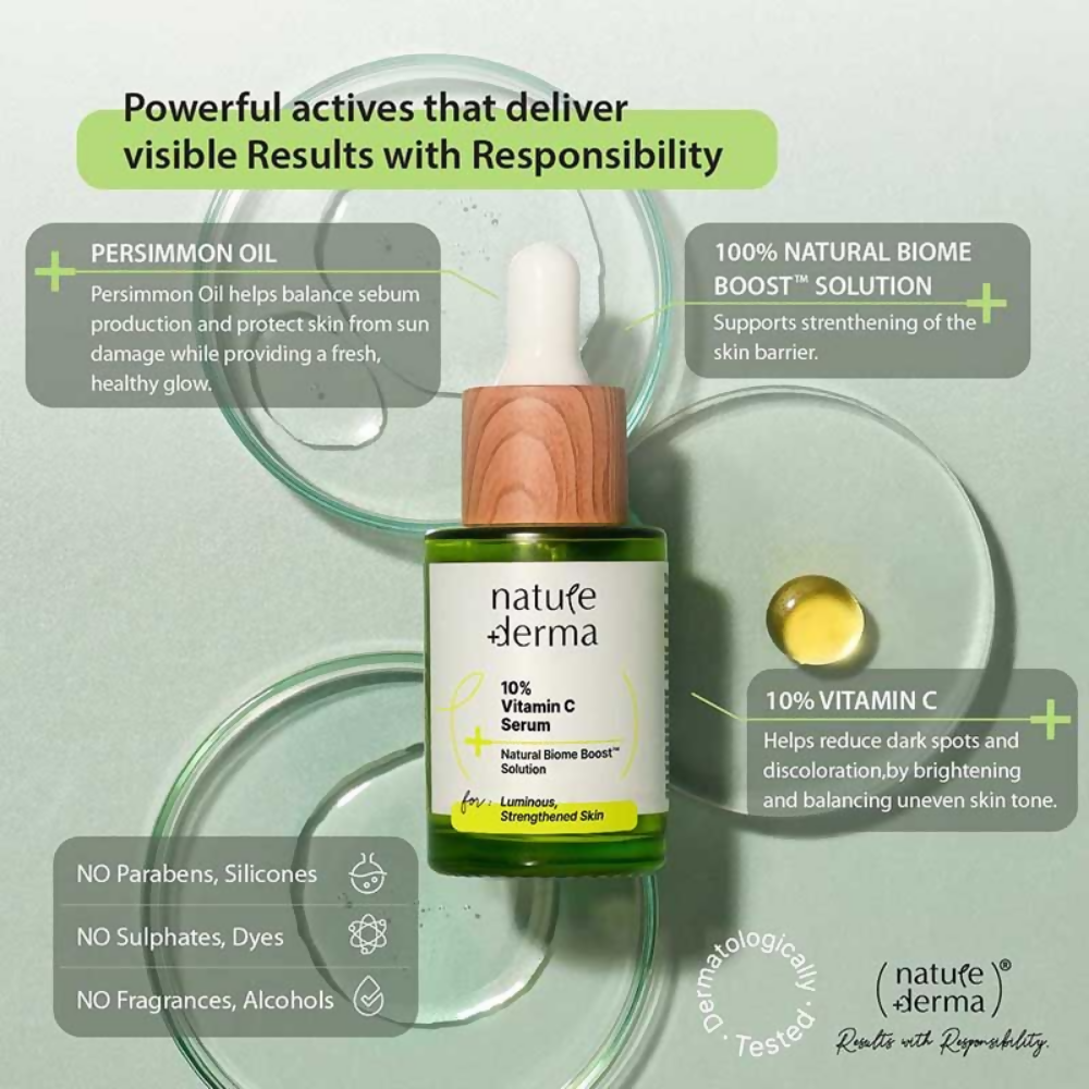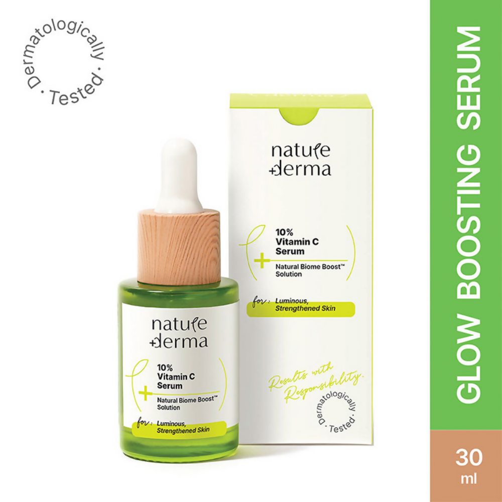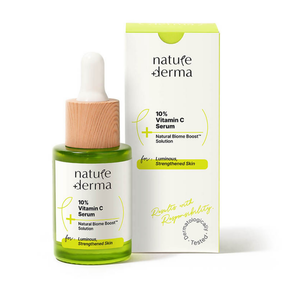 Nature Derma 10% Vitamin C Serum offers a potent and effective approach to achieving more radiant, healthier-looking skin. This serum merges two essential components, Vitamin C and Natural Biome-Boost Solution, delivering numerous benefits to your skin. Renowned for its antioxidant qualities, Vitamin C supports the skin's natural renewal process and aids in preventing premature skin aging.