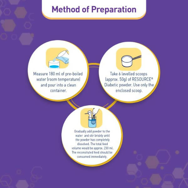 - Take 6 leveled scoops (approx. 50g) of Resource Diabetic powder. Use only the enclosed scoop.