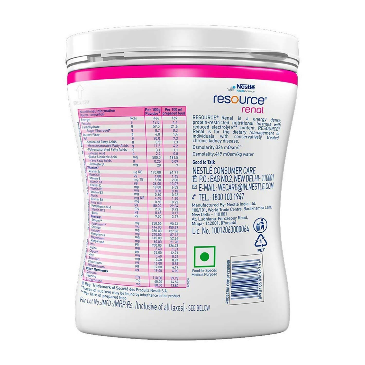 Resource Renal contains 12g of protein per 100g of powder
