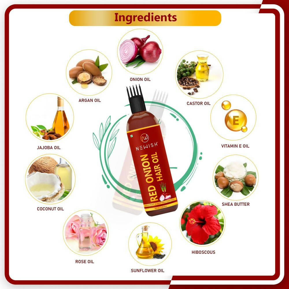 - Onion Oil, Hibiscus Oil, Rose Oil, Sunflower Oil, Moroccan Argan Oil, Mango Butter, Jojoba Oil, Bhringraj, Neem Oil, Vitamin E