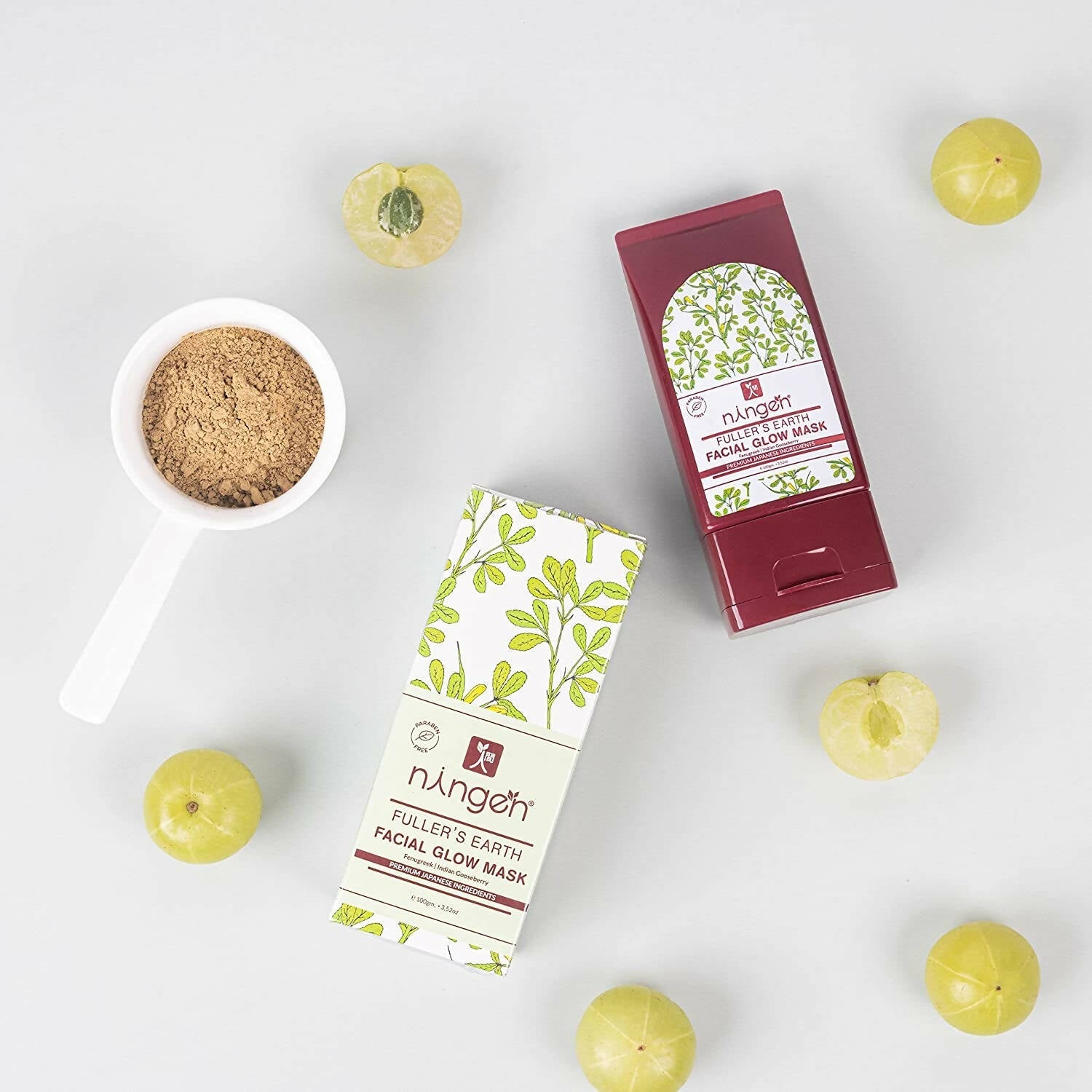 - Ningen Fuller’s Earth Radiance Facial Mask is enriched with the beneficial properties of Fuller’s Earth, Amla, and Fenugreek. These elements deeply penetrate the skin's surface, leading to smoother and more voluminous skin when applied.