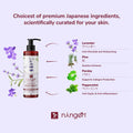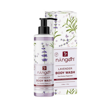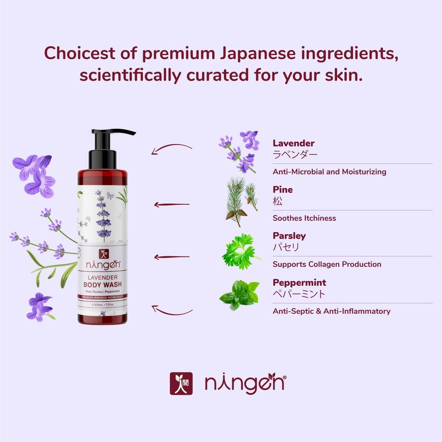 - The Ningen Lavender Body Wash Gel, enriched with Pine, Lavender, Parsley extract, and Peppermint oil, creates a luxurious aromatic lather on your skin, helping to unclog pores and eliminate impurities.