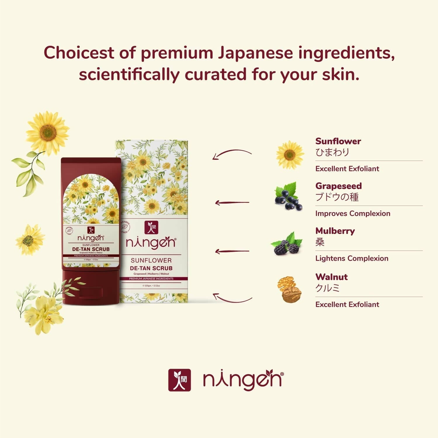 - The Ningen Sunflower De-Tan Scrub, crafted with Sunflower, Grapeseed Oil, Mulberry, and Walnut granules, effectively exfoliates and eliminates tan, while preserving the skin's moisture.