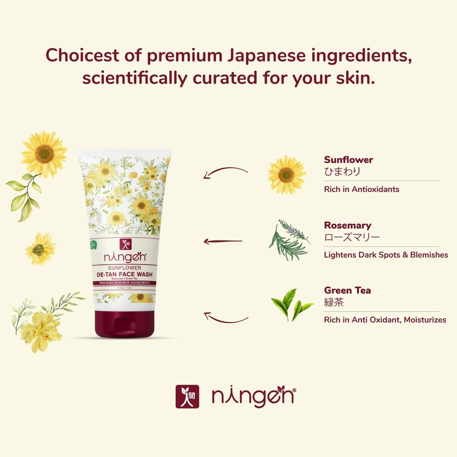 - Infused with sunflower, rosemary, and green tea extracts, the Ningen Sunflower De-Tan Face Wash effectively rejuvenates your skin's glow, eliminating impurities and reducing excessive tanning, resulting in a smoother, more radiant, and healthier complexion. It also provides anti-itching and anti-pollution benefits for luminous skin.