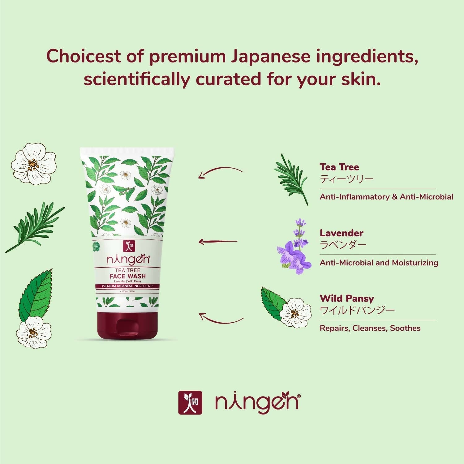 - Ningen Tea Tree Face Wash, enriched with tea tree oil, wild pansy, and lavender, effectively rejuvenates your skin's glow, addressing blemishes and scars for a smoother and more radiant complexion.