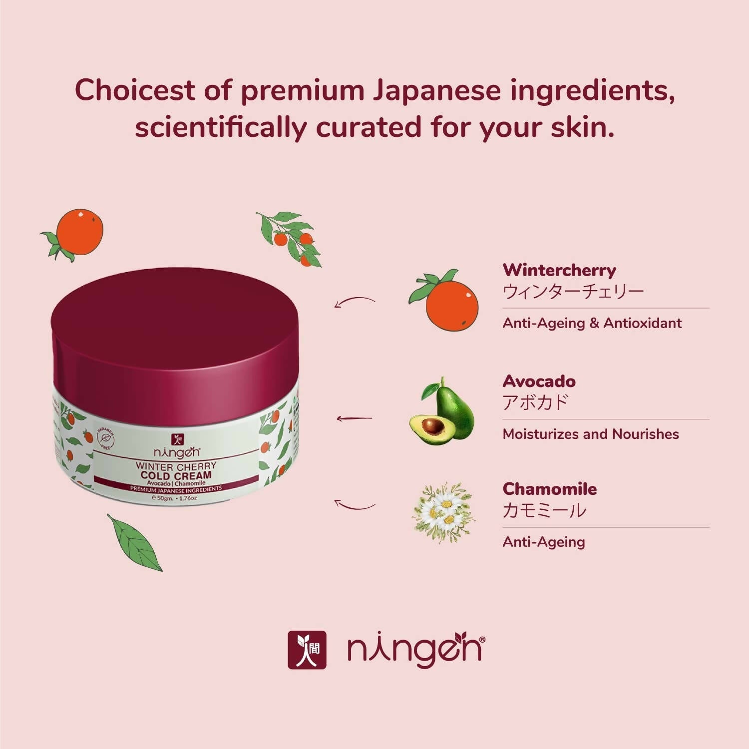 - Ningen Winter Cherry Cold Cream, enriched with Winter Cherry, Avocado, and Chamomile, ensures your skin stays moisturized while softening, repairing, and healing dry, chapped skin.