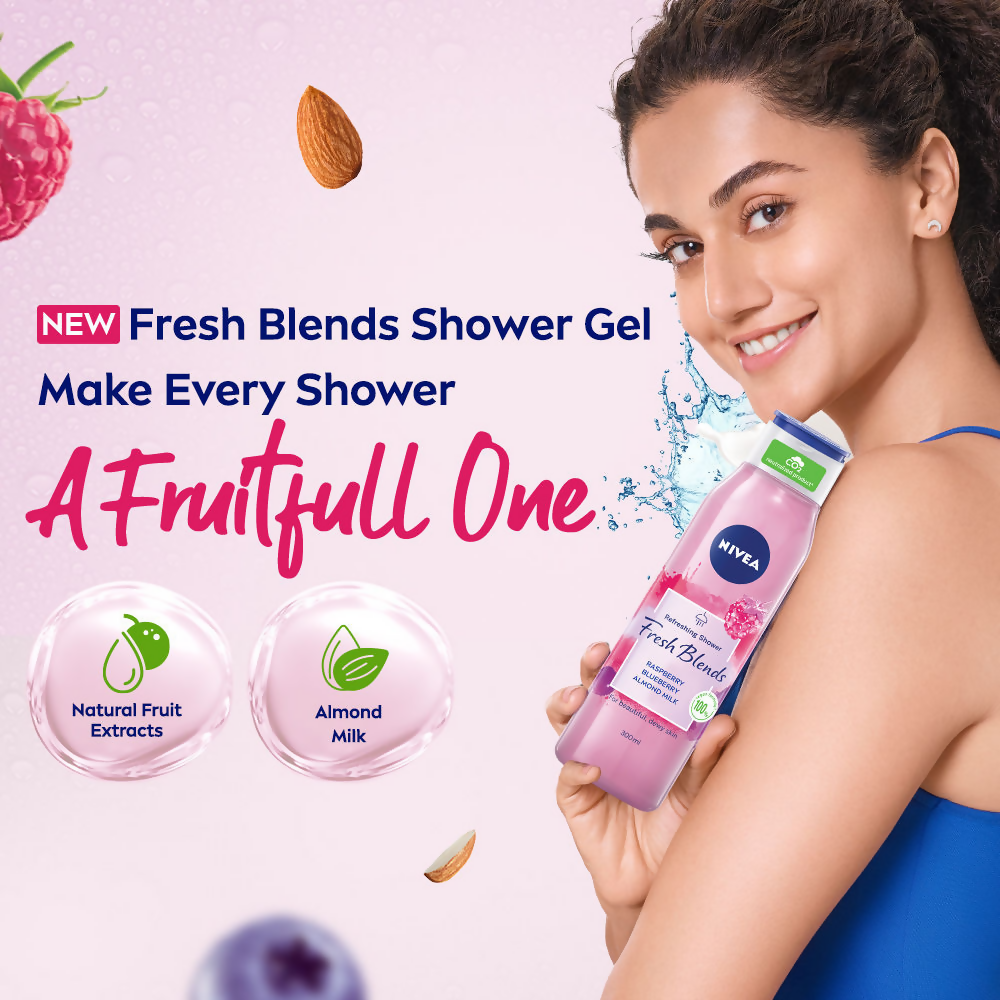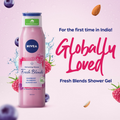 - Step 2: Squeeze a small coin-sized amount of the fruity Fresh Blends shower gel onto your loofah or hand. Observe as the gel emerges, resembling a refreshing and fruity concoction!