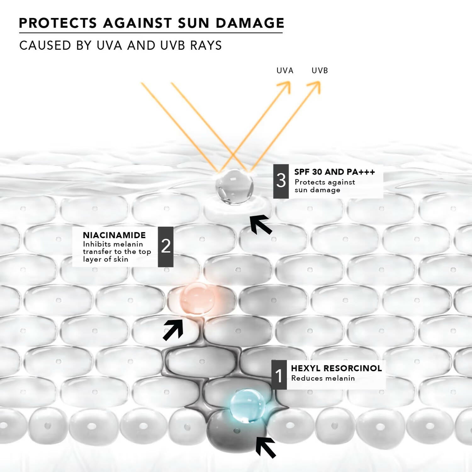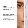 - Featuring 3.25% Hexylresorcinol + Niacinamide, this SPF cream offers broad-spectrum protection with SPF 30 and PA+++, guarding against harmful UVA and UVB rays. It absorbs seamlessly without leaving a white residue and helps diminish discoloration due to sun exposure.