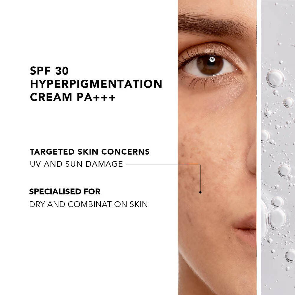 - This SPF 30 Hyperpigmentation cream combines hexylresorcinol and niacinamide, effectively shielding skin from tanning by reducing melanin production and transfer.