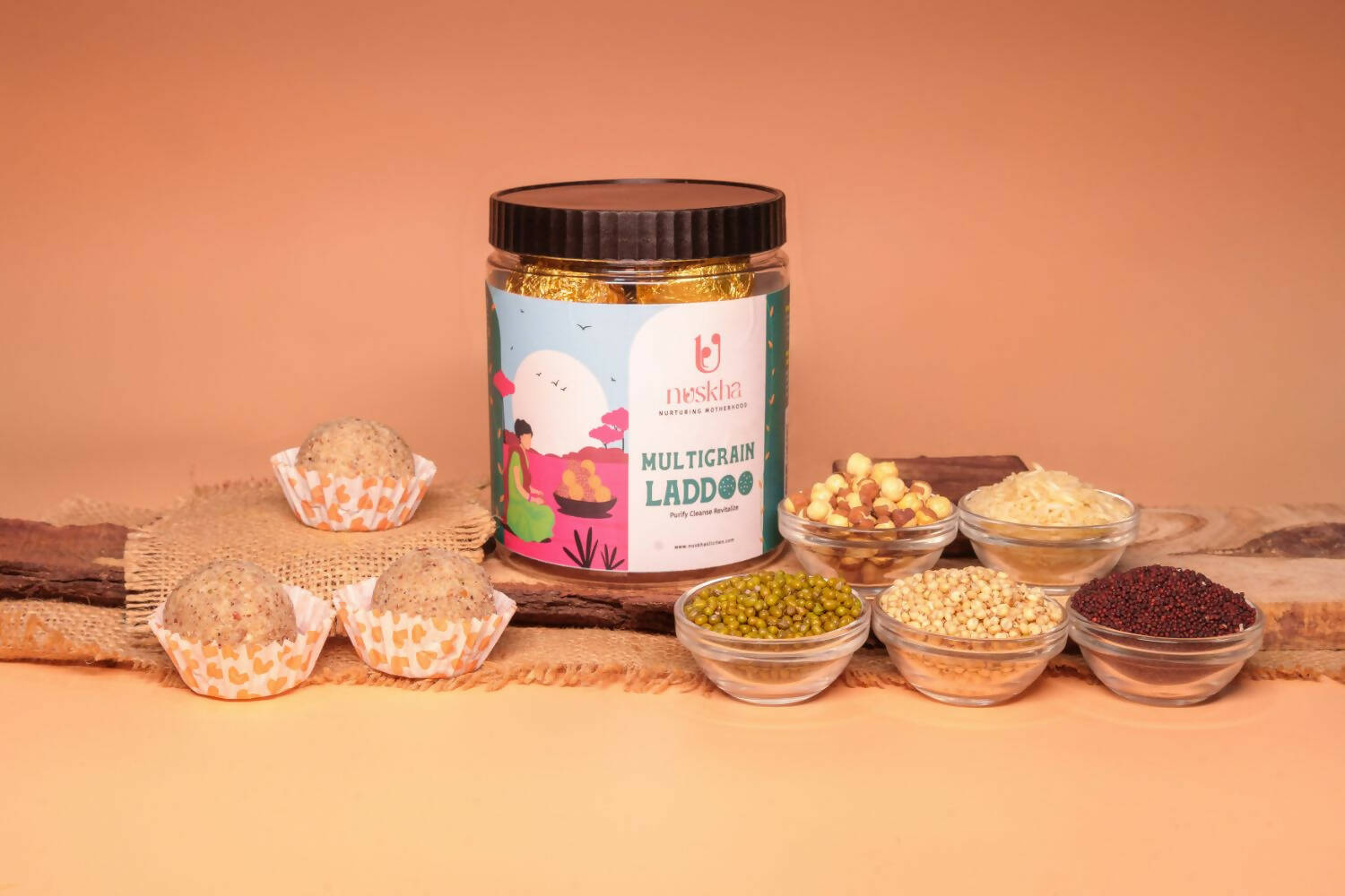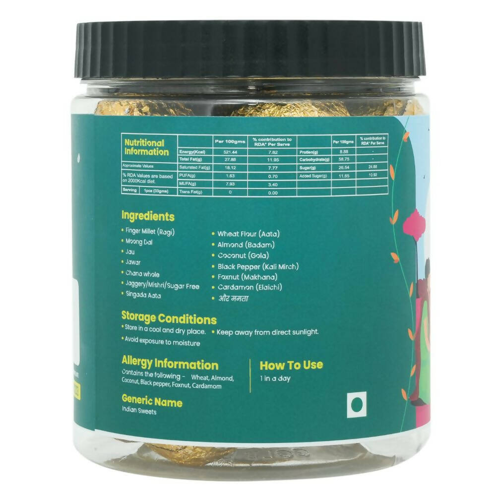 - The hearty, nutty essence of organic grains is perfectly paired with the natural sweetness of jaggery, creating a harmonious flavor profile. The laddoos are subtly spiced with fragrant cardamom and cinnamon, enhancing their taste complexity.