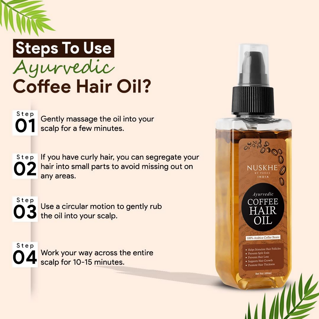- Are you weary of your lackluster and lifeless hair? Hair loss is even more distressing! What causes dull hair? Dull hair often exhibits certain traits: It generally lacks shine, feels rough or coarse, and might appear frizzy or weighted down. Our Nuskhe By Paras Ayurvedic Coffee Hair Oil is perfect for you. Now it's possible to transform your lackluster locks into hair that is healthier, shinier, and more manageable. Ayurvedic Coffee Hair Oil Enriched with COFFEE ARABICA SEED OIL: For anti-dandruff, hair growth, healthy scalp, conditioning, hair strengthening, hair thickening, split ends, and hair fall prevention. SUNFLOWER OIL: Sunflower oil also contains oleic acid, which can prevent hair breakage and may give the impression of faster hair growth. SWEET ALMOND OIL: Aids in boosting blood circulation to the area and introduces potent antioxidants to the skin on your scalp.