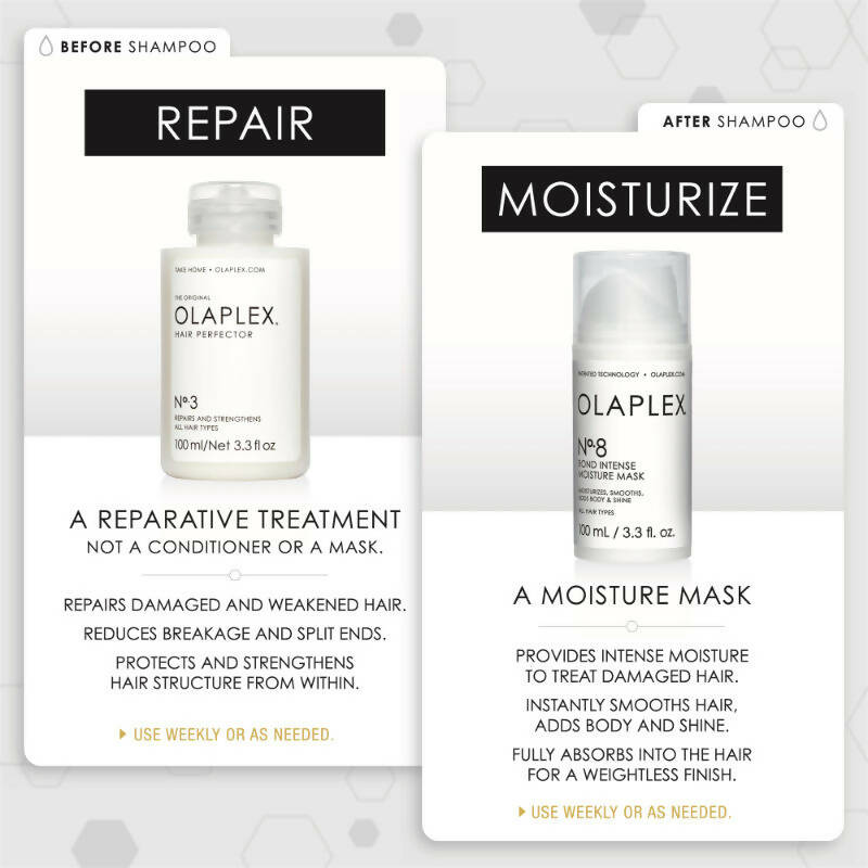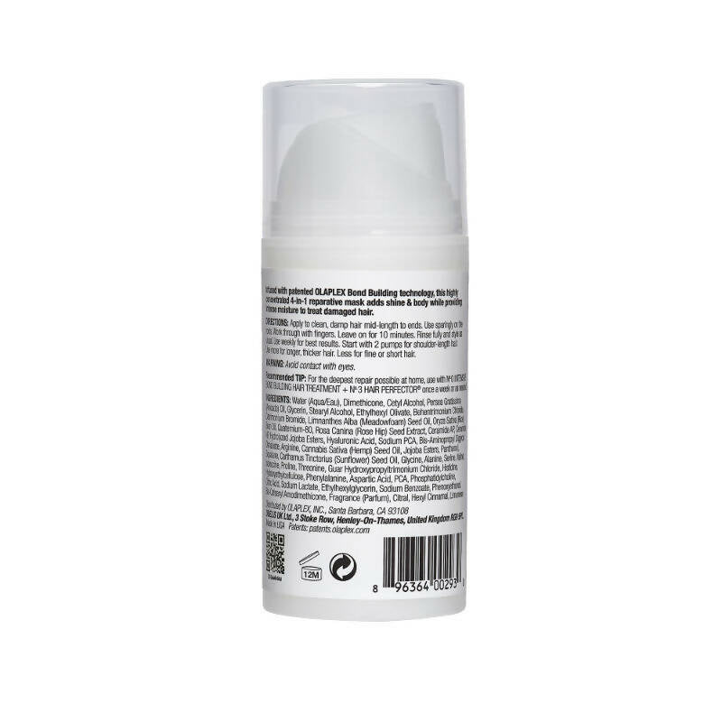 - What it is: Enriched with the exclusive OLAPLEX Bond Building technology, this potent reparative mask enhances shine, smoothness, and volume while delivering deep moisture to rejuvenate damaged hair.