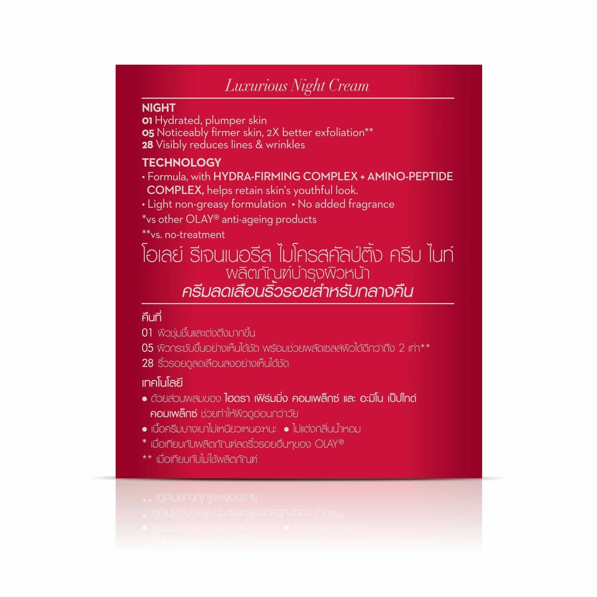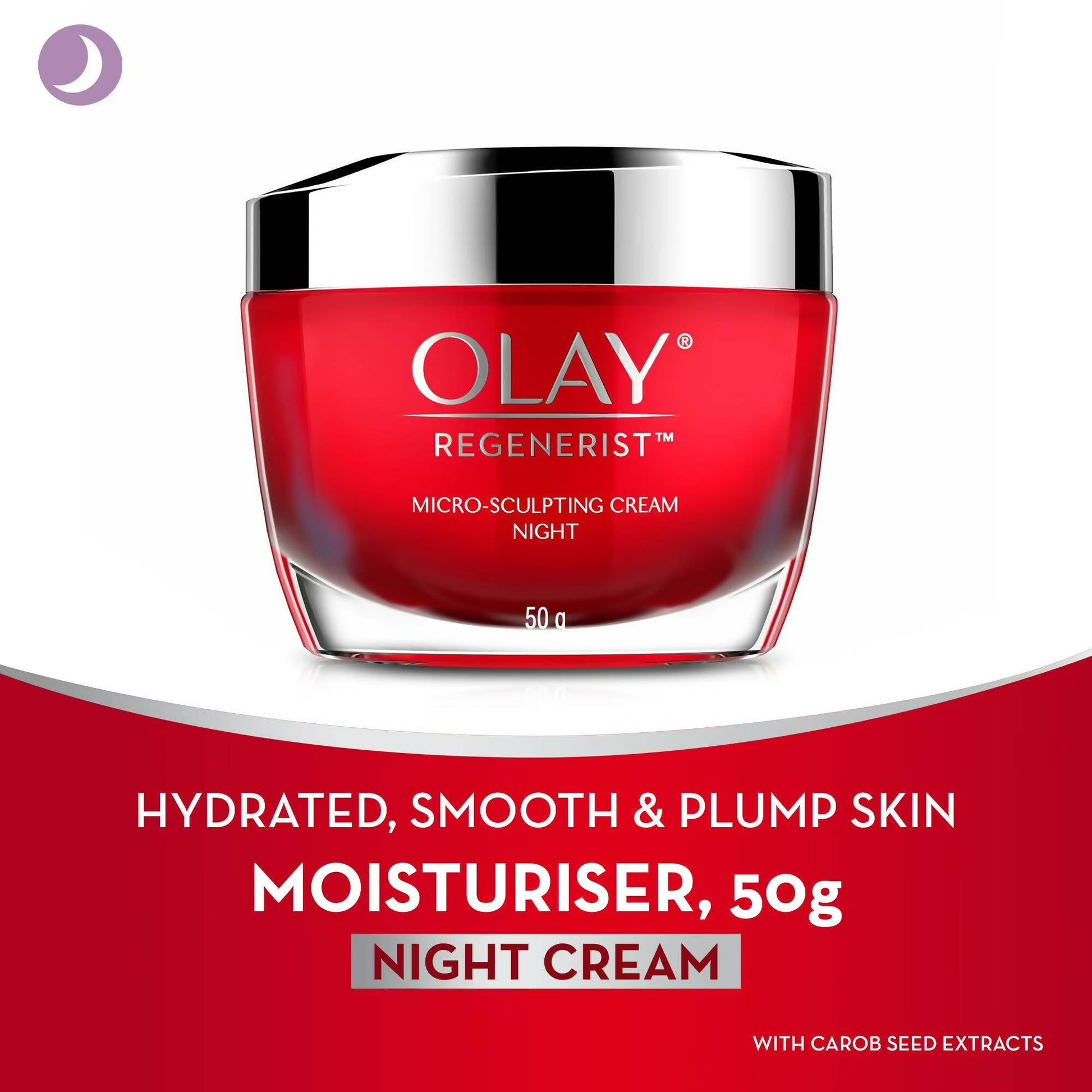 - Olay's micro-sculpting Regenerist Night formula is infused with potent ingredients that penetrate 10 layers beneath the skin's surface. The Amino Peptide Complex refines fine lines and enhances collagen synthesis, while Vitamin B3 revitalizes your cells and maintains skin moisture. Hyaluronic acid attracts hydration, ensuring your skin remains moist and supple. Unique carob seed extracts amplify your skin’s innate collagen and hyaluronic acid generation. Experience visible skin improvements from the very first day. Achieve hydrated, smooth, and plump skin. Begin your journey to a youthful radiance with Regenerist Micro-Sculpting Night Cream. Gently massage a small amount onto your face and neck using your fingertips in an upward circular motion, concentrating on areas such as the brow and jawline.