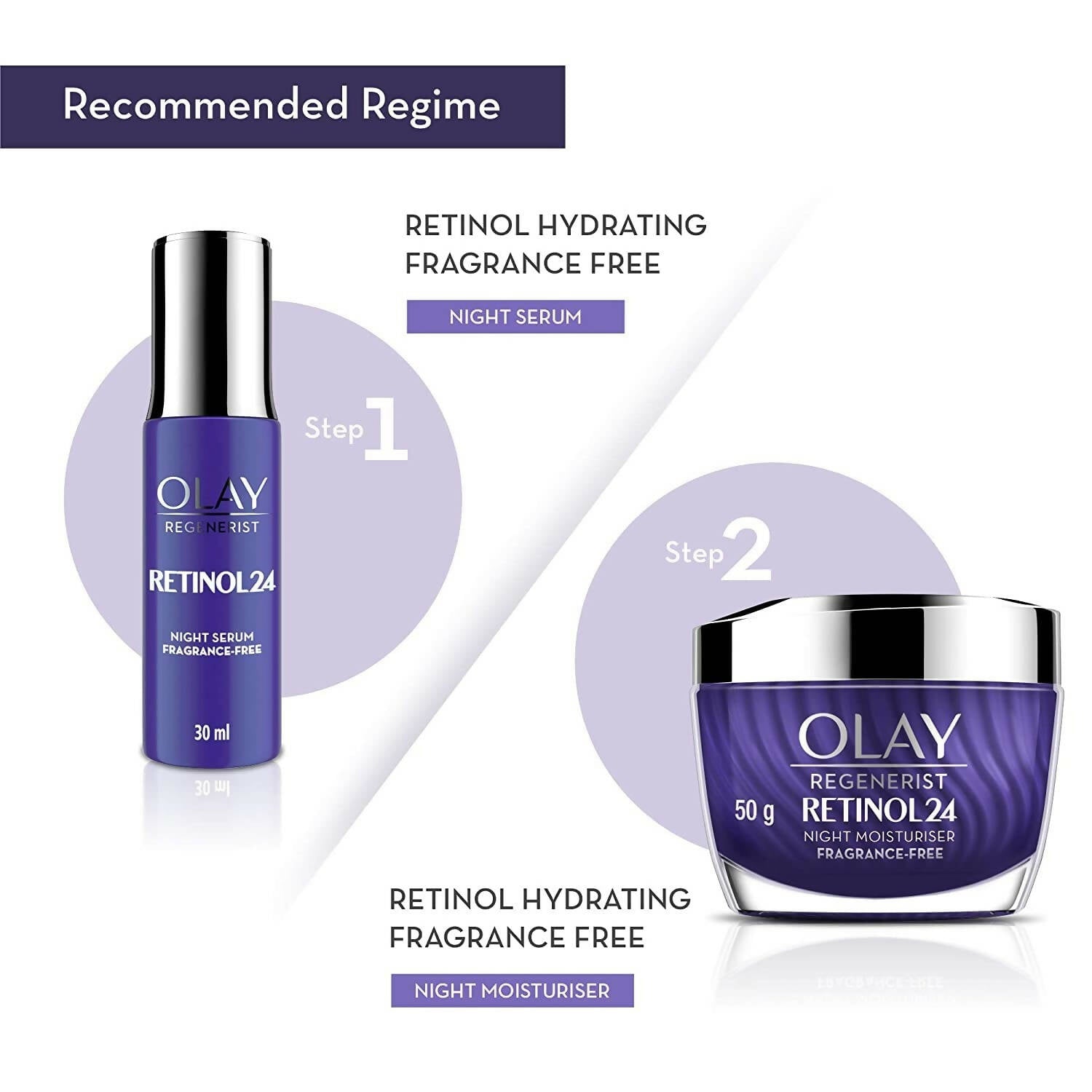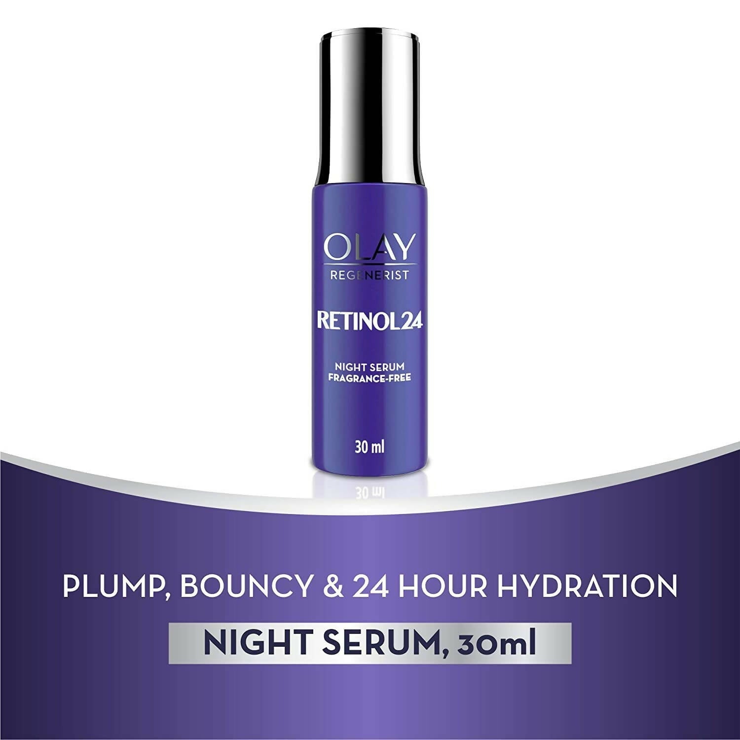 - Experience our newest night serum featuring a unique combination of Niacinamide and Retinol complex. The Olay Regenerist RETINOL24 Night Facial Serum penetrates deeply into the skin’s surface layers. Witness noticeable enhancements in fine lines and wrinkles, smoothness, luminosity, firmness, dark spots, and pores. Olay RETINOL24 Night Serum provides a wealth of skin benefits with 24-hour hydration and minimal irritation. This fragrance-free and dye-free formula absorbs swiftly and delves deep into your skin’s surface, ensuring you wake up each morning to rejuvenated, glowing skin. Pair with Olay Regenerist Micro-Sculpting Cream at night and observe skin transformation in 28 days.