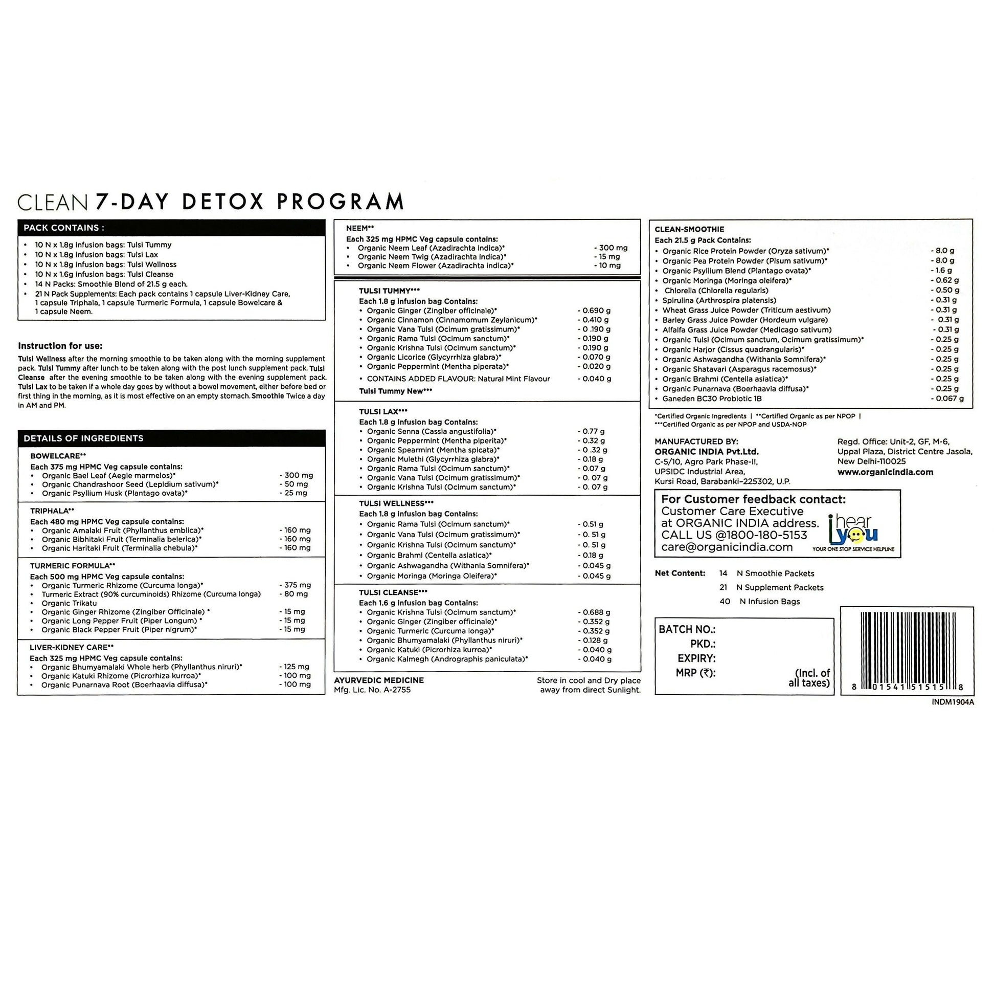 - Achieving a healthy lifestyle is made simple with the ORGANIC INDIA Clean 7 Days Kit - a complete program for detoxification and revitalization of the body! It serves as a reminder of clean eating and lifestyle habits, helping you to realign after festivities or significant events. These nutritious and meticulously selected ingredients, delivered through teas, infusions, and smoothies, are perfect for enhancing the body’s natural ability to eliminate toxins, boost immune function, and promote optimal health. Experience a renewed sense of energy and vitality with the potency of pure herbs.