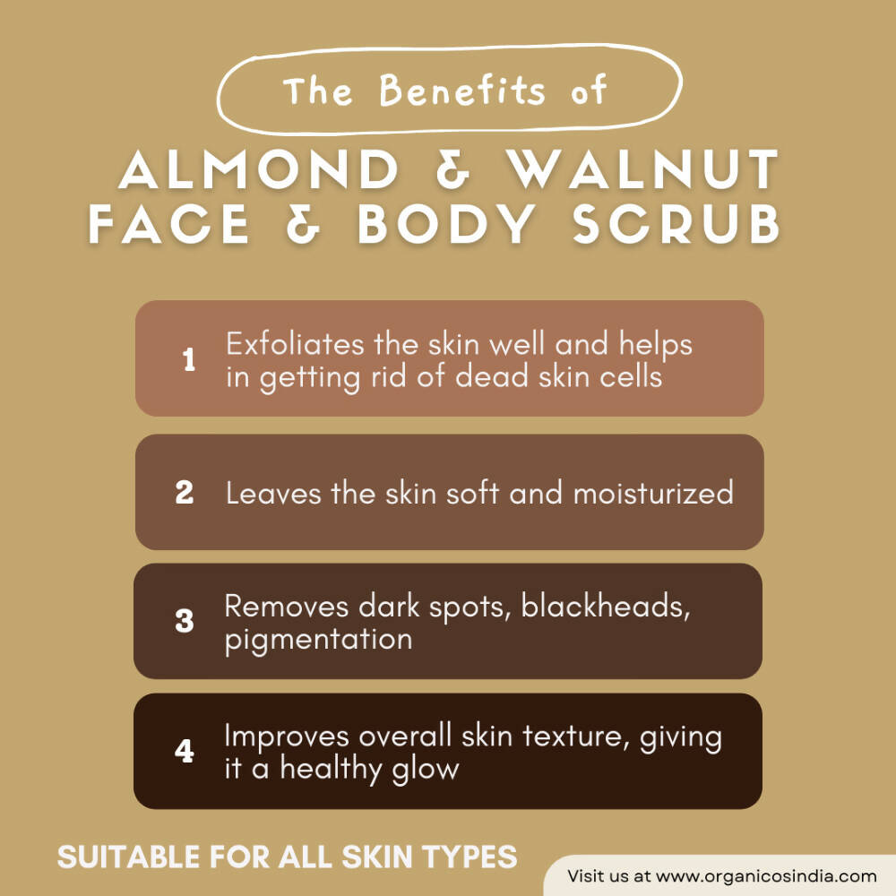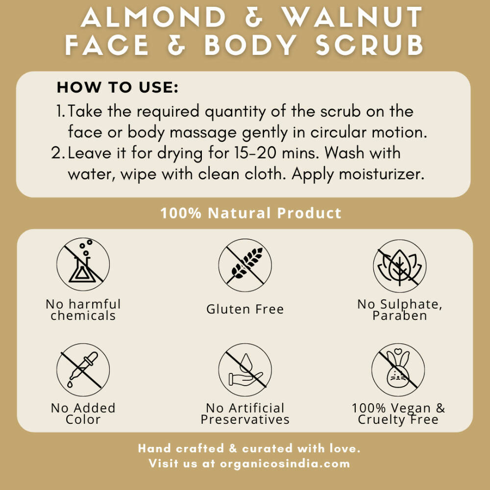 - Argan Oil, Almond Oil, Shea Butter, Walnut Shell Powder, Apricot Oil, and DM Water.