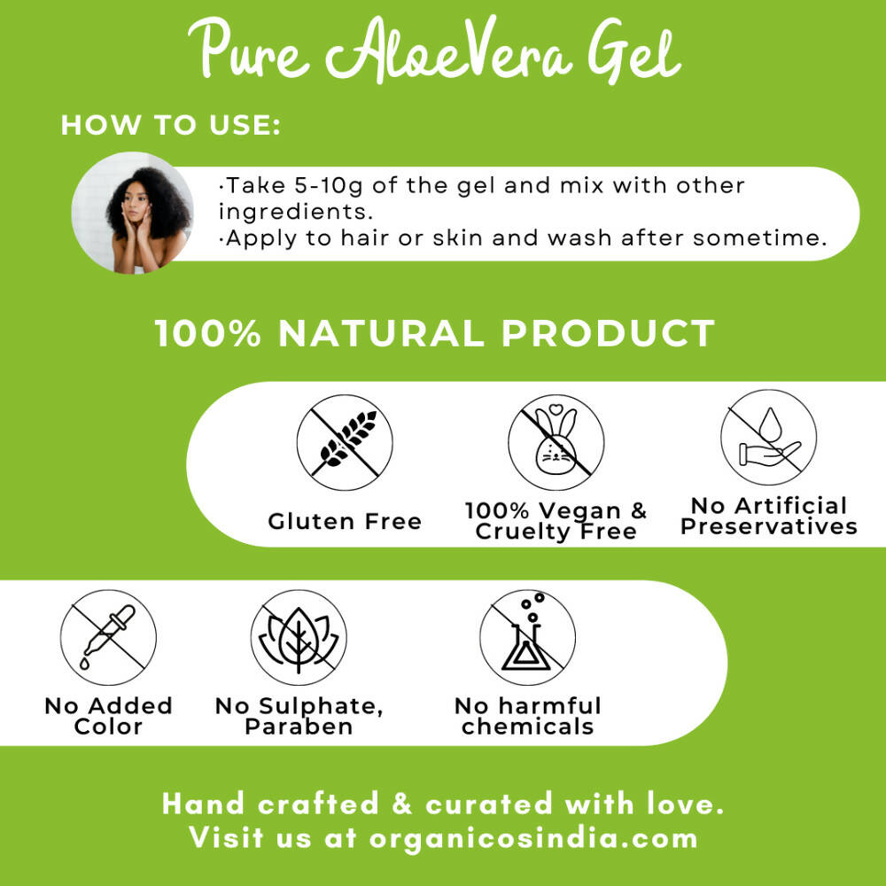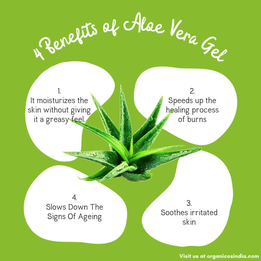 - Organicos Aloe Vera Face Gel features organic Aloe Vera and is gentle on the skin. It is ideal for hydrating the face, arms, legs, and hair. Experience immediate hydration without any sticky sensation. The vitamins from Aloe Vera, including E, C, and additional minerals, keep the skin nourished and shielded from UV rays.