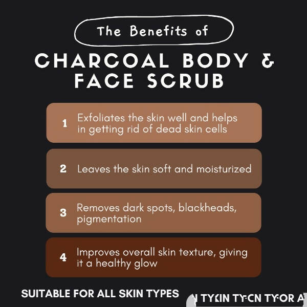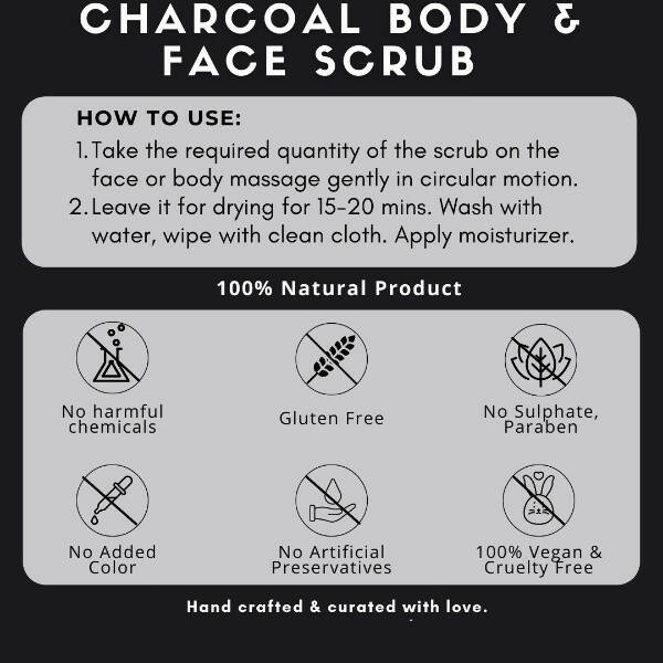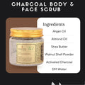- Argan Oil, Almond Oil, Shea Butter, Walnut Shell Powder, Activated charcoal, and DM Water.