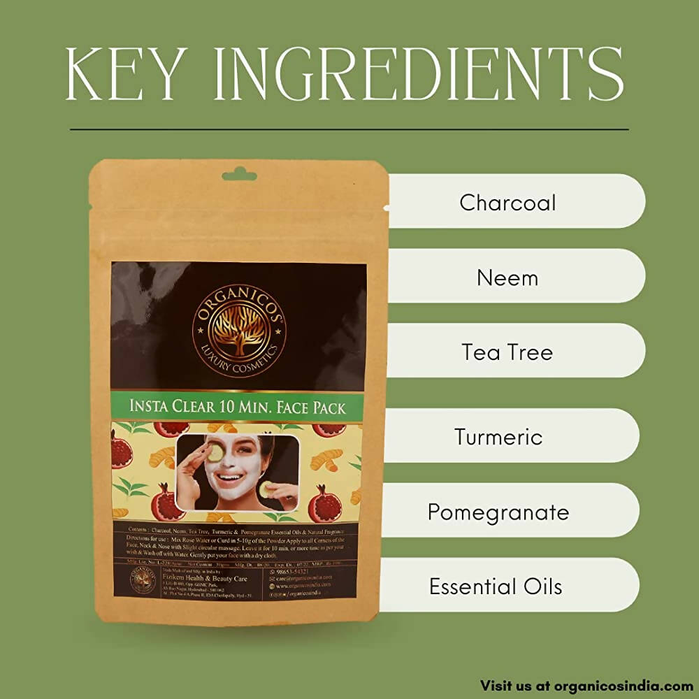 - Blend 5-10 gm of Organicos Insta Clear Face Pack with rose water or yogurt; apply evenly over the face, neck, and nose with gentle circular motions; allow it to sit for 10 minutes before rinsing with cold water and patting dry to achieve smooth, blemish-free, naturally glowing skin.