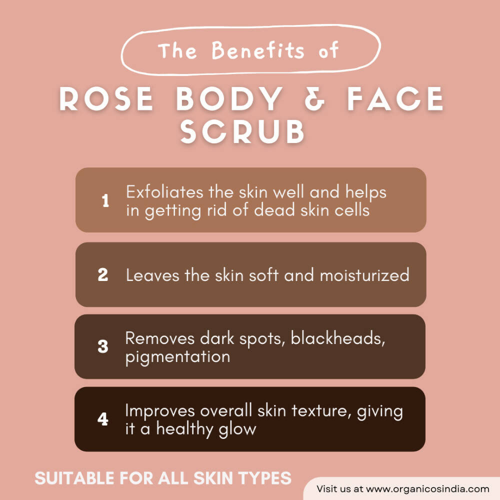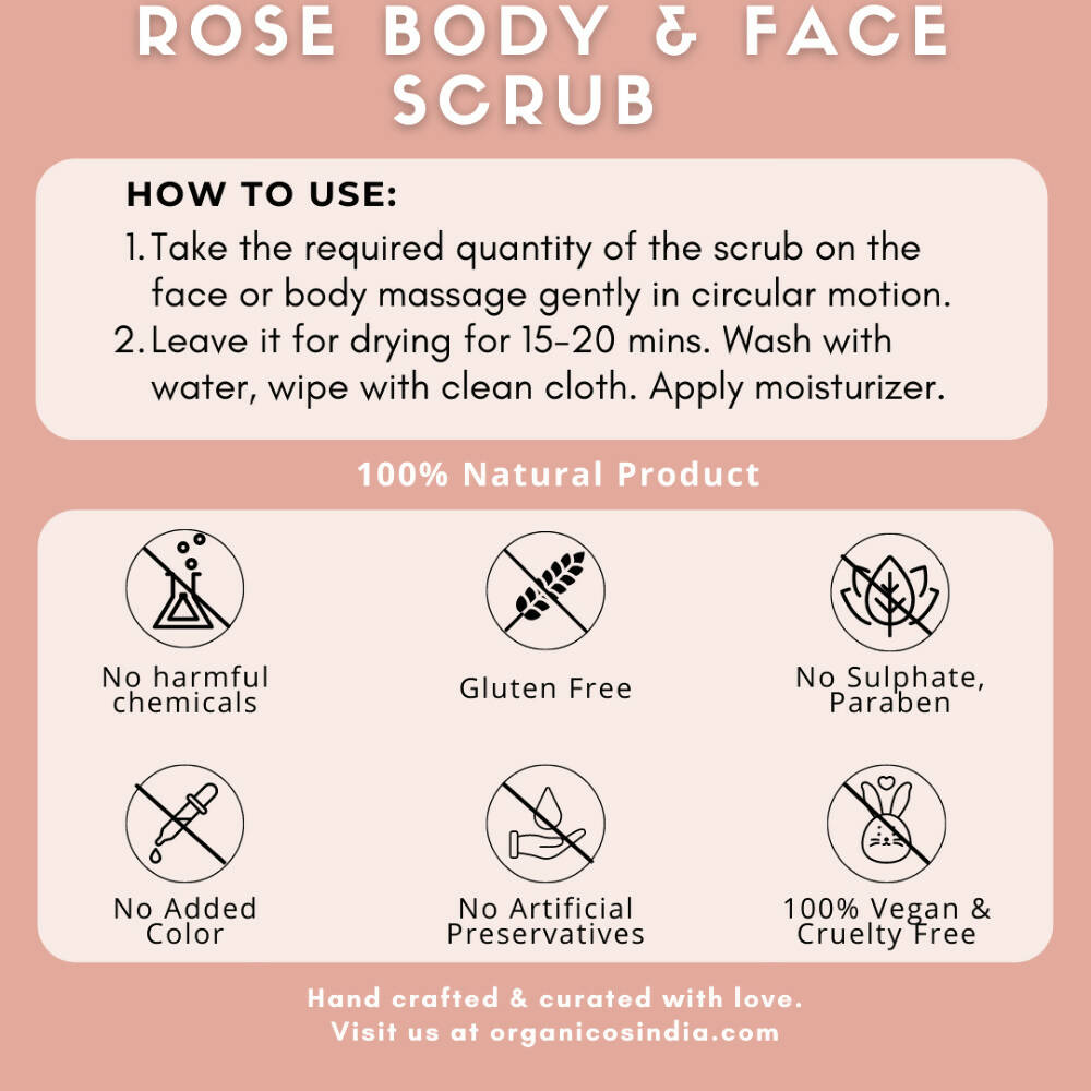 - Argan Oil, Almond Oil, Shea Butter, Walnut Shell Powder, Rose Petals Powder, and DM Water.